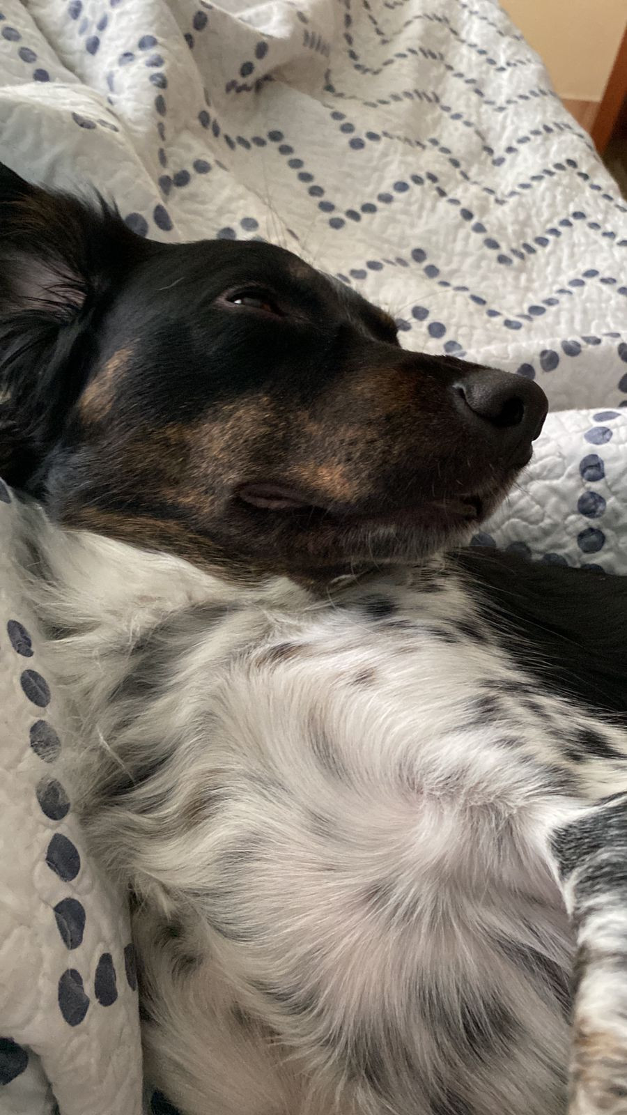 ✅ Es una perrita criolla, blanca con manchas negras, tiene pintas amarillas en sus patitas.