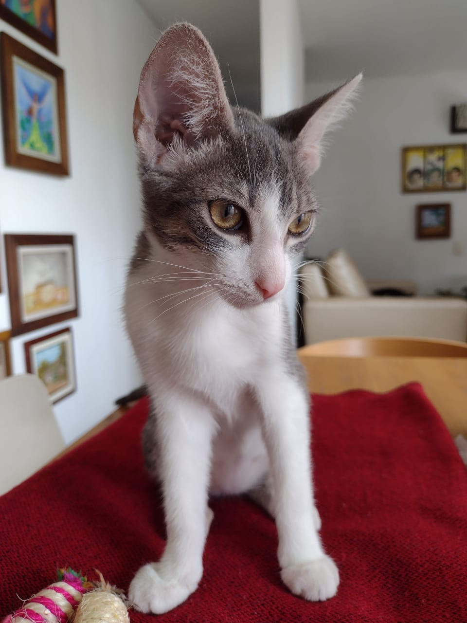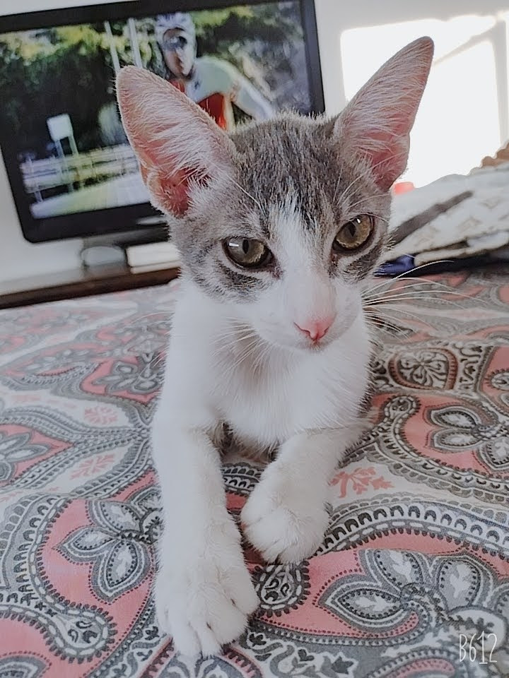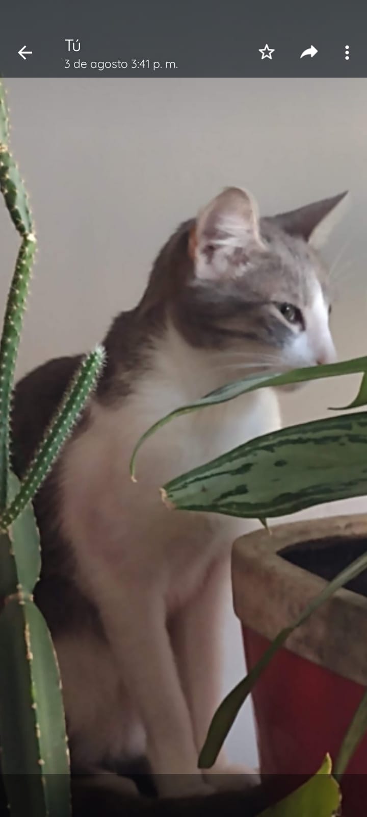 ✅ Es una gatica, flaquita, es de color gris con blanco, es delgada, y su cuerpo más largo de lo normal.