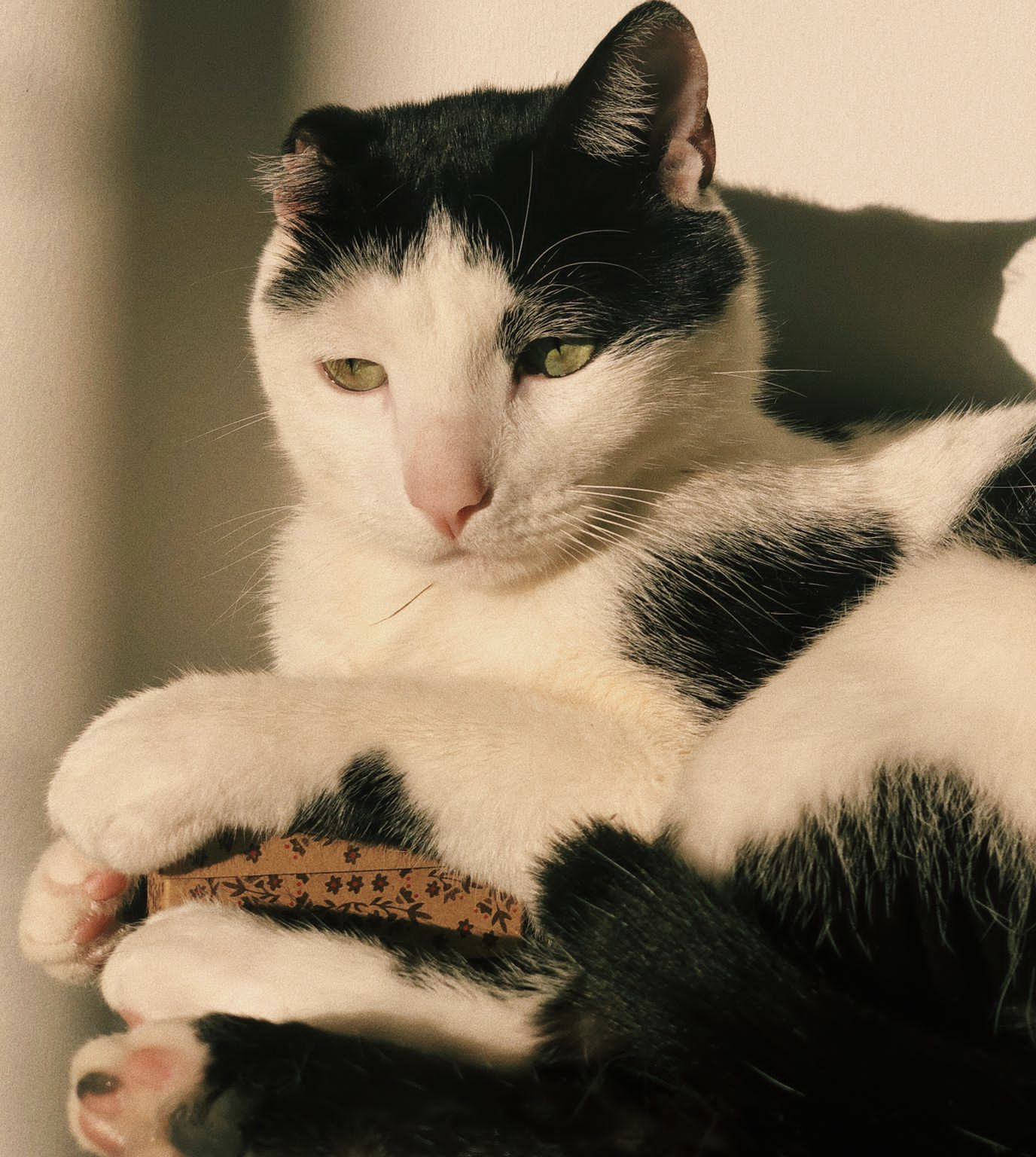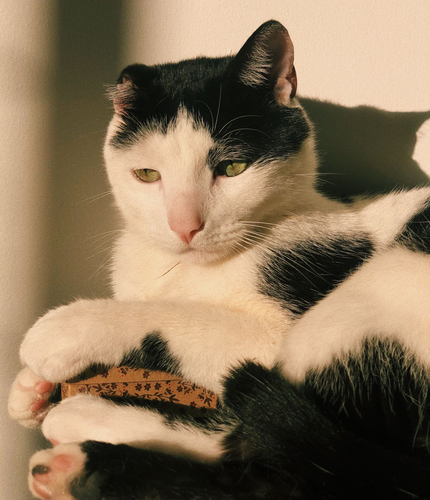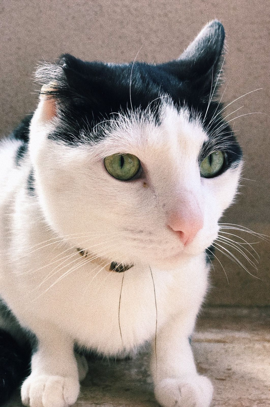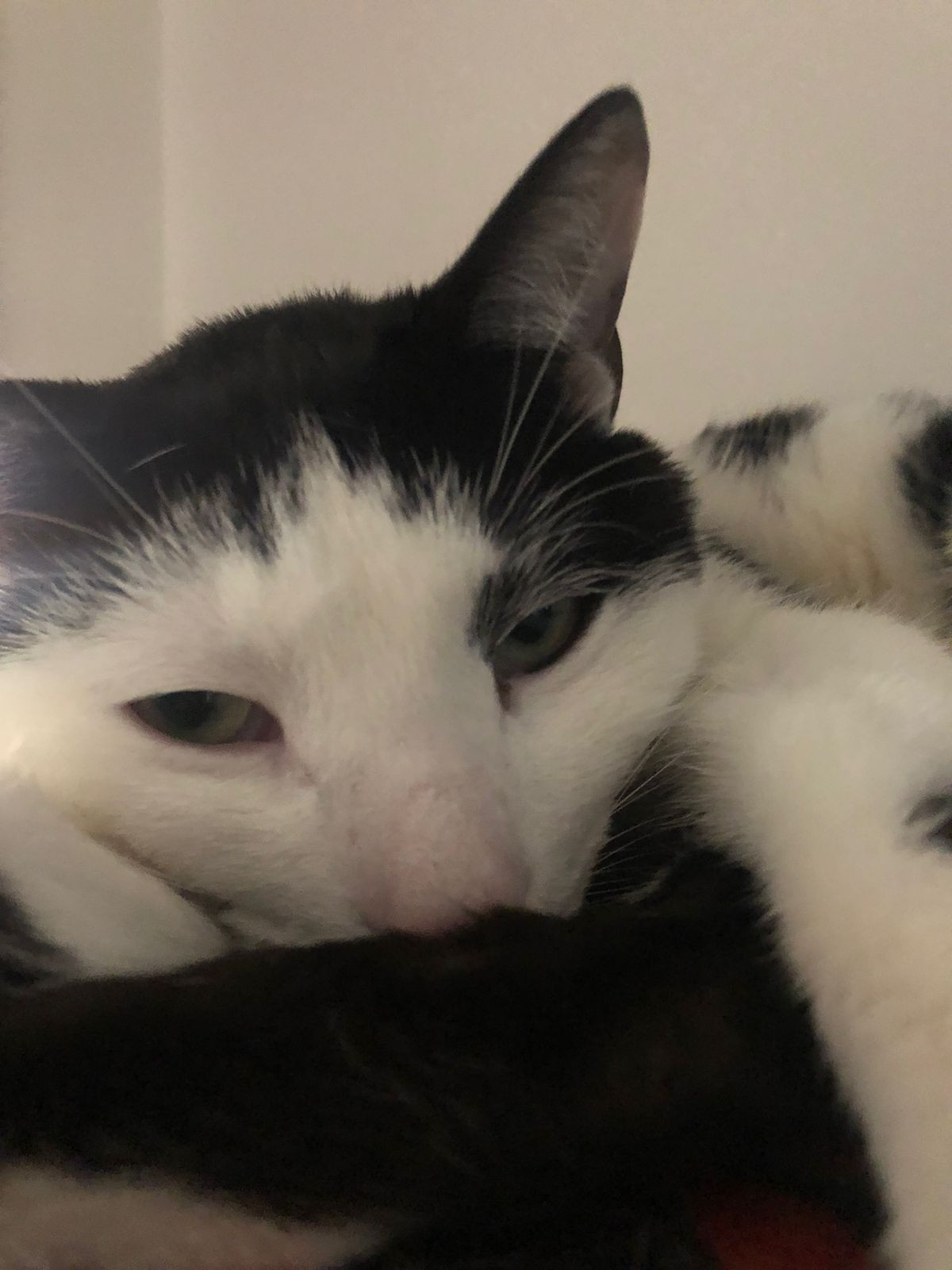 ✅ Tom es blanco y negro, delgado, ojos verdes y solo tiene una orejita.