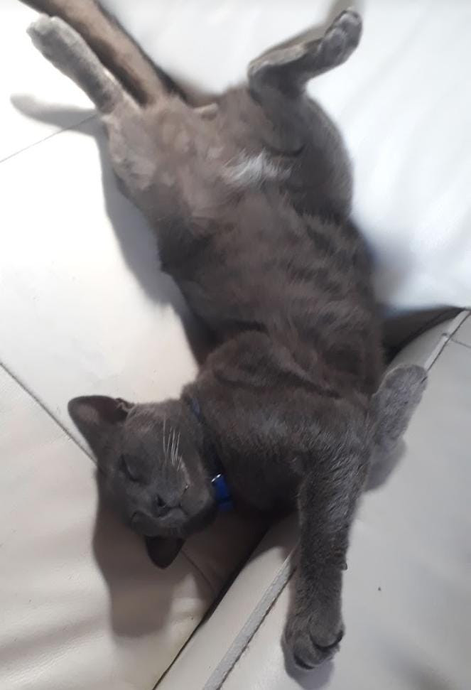✅ Es un gatico, de color gris plata, sus bigotes son blancos hasta la mitad y la otra mitad negros; tiene en la pancita pelitos plancos, y sus ojos son amarillos.