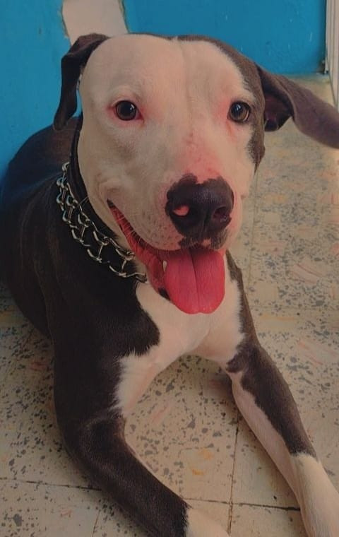 ✅ Es un perrito, macho, de raza pitbull, de tamaño grande, su piel es gris y su pelito es blanco.