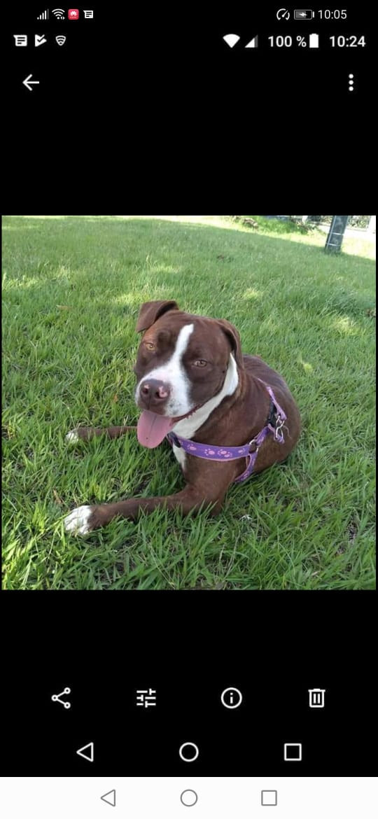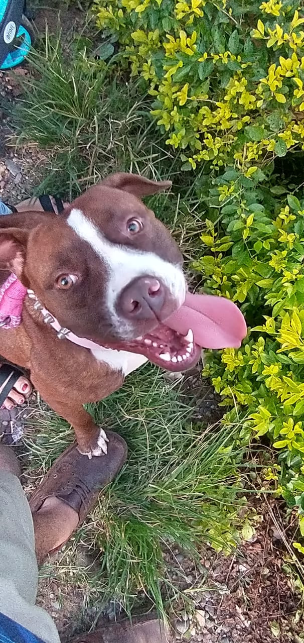 ✅ Es una perrita, hembra, es de raza pitbull, es de tamaño grande, su color es café con manchas blancas, tiene la nariz café con manchas blancas.