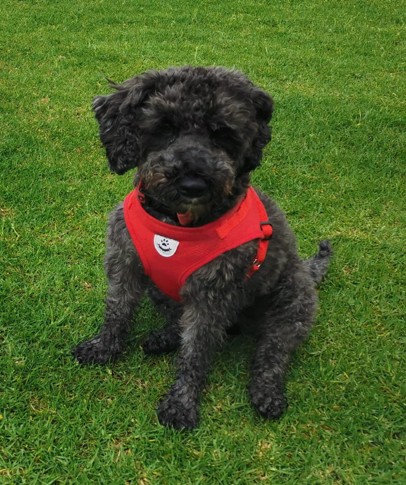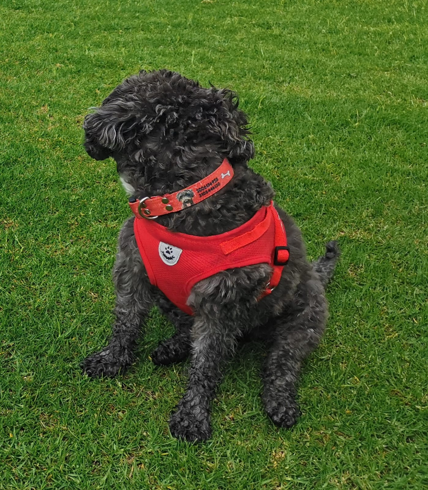 ✅ En el momento que se extravió tenía puesto un collar rojo con su nombre, su foto y datos de contacto de los dueños y un arnés rojo reflectivo.