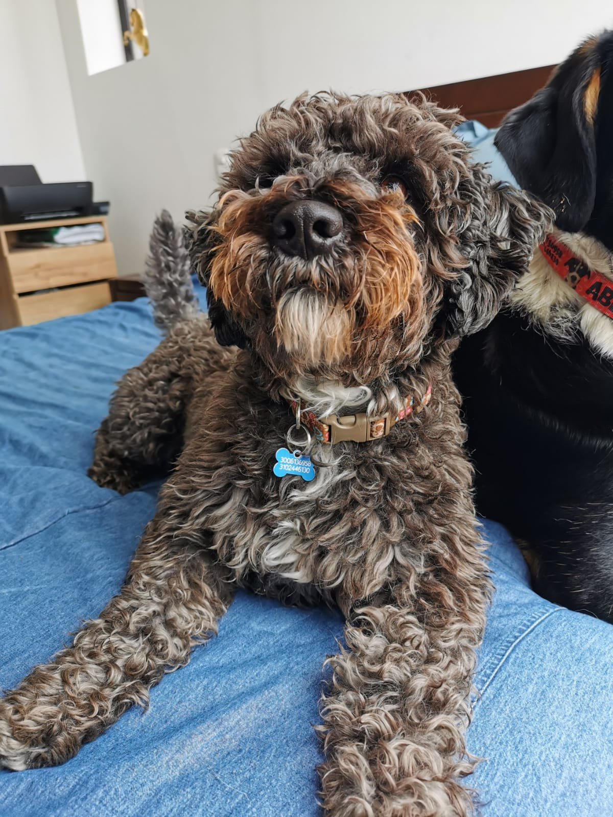 ✅ Es un perro pequeño, gordito, pesa 10 kilos aprox, tiene la cola larga, tiene corte medio, pequeña manchita blanca en el cuello, barbas cafecitas.