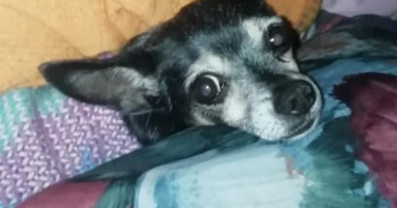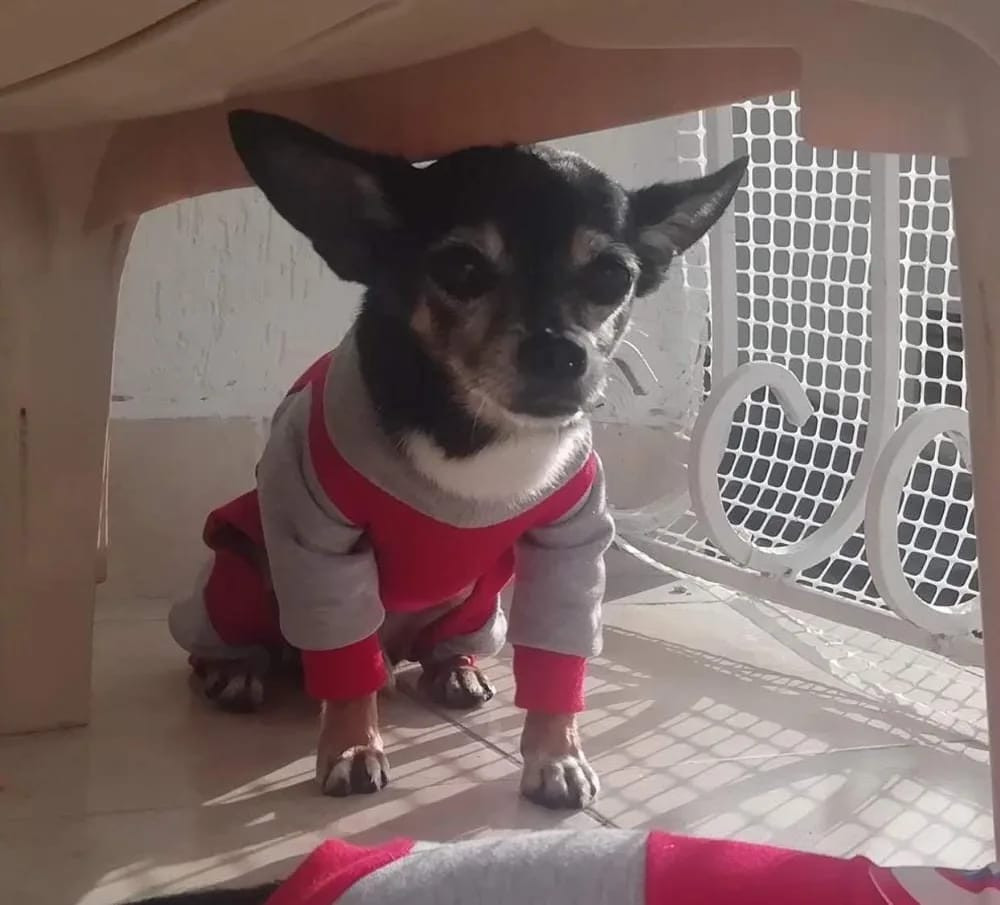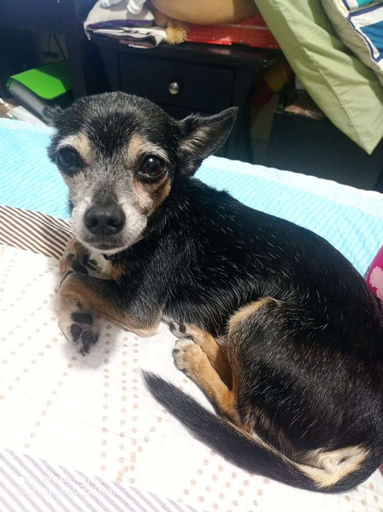 ✅ Es un perrito, macho, de raza pincher chihuahua, es negro, canoso la carita, tiene su cola larga, sus orejas son paradas y sus paticas son blancas.