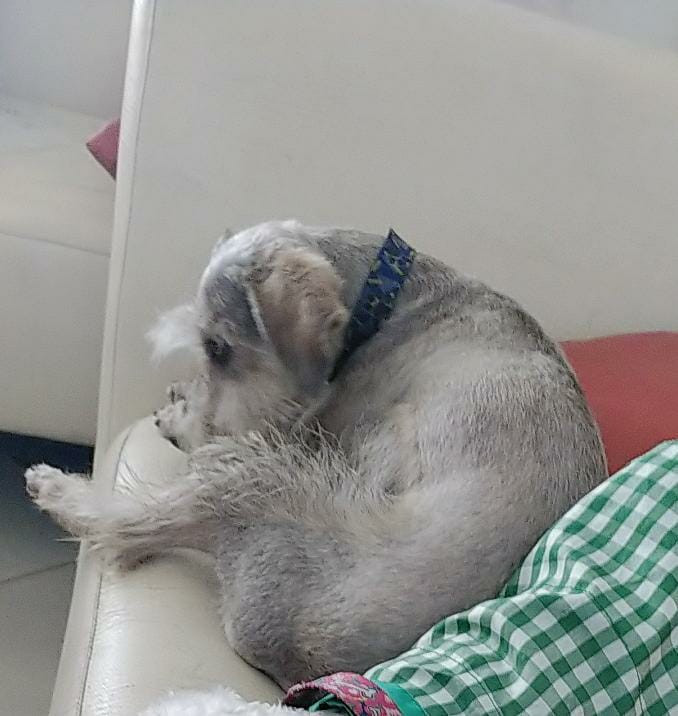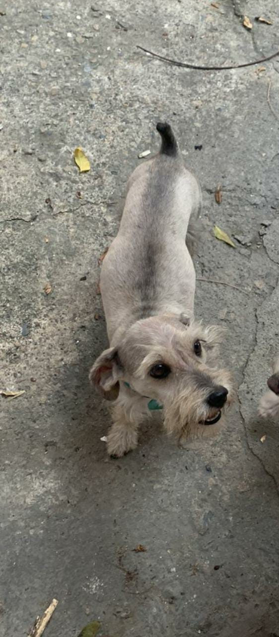 ✅ Es un perrito de raza Schnauzer, es pequeño de colo, bigotes blancos.