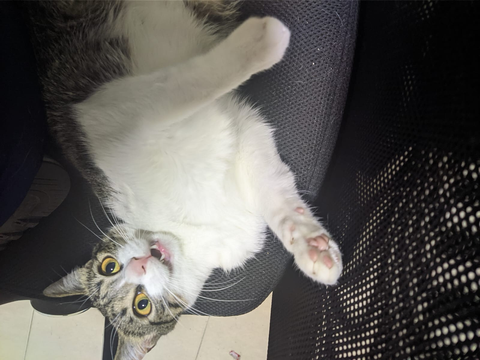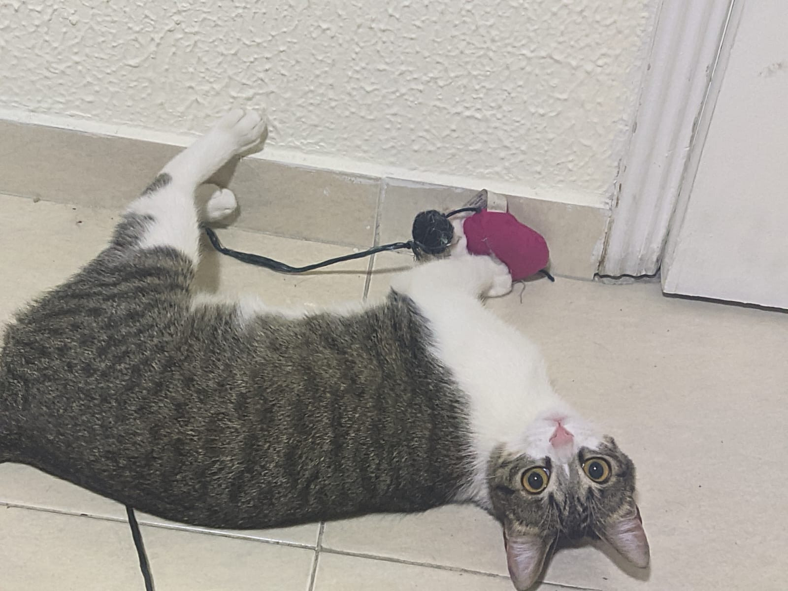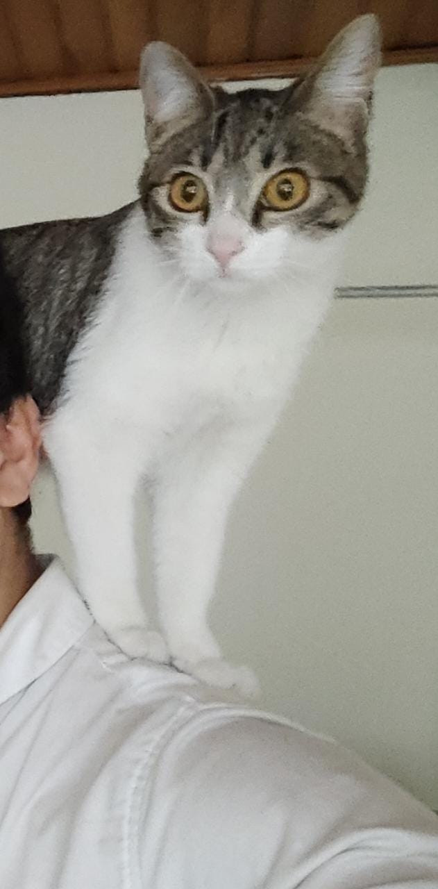 ✅ Es una gatita de de ojos amarillos, blanca atrigrada, el pulgar derecho es negro, la cola es gris con negro, chip de ciudadana cuatro patas, tatuaje de esterilización en la oreja derecha.