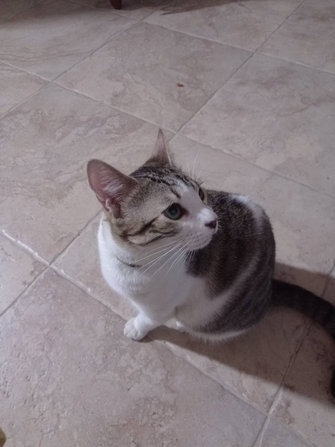 ✅ Es un gatito de color gris con blanco, tiene su cola de rayas negro con gris, tiene sus colmillos partidos, sus ojos son verdes.