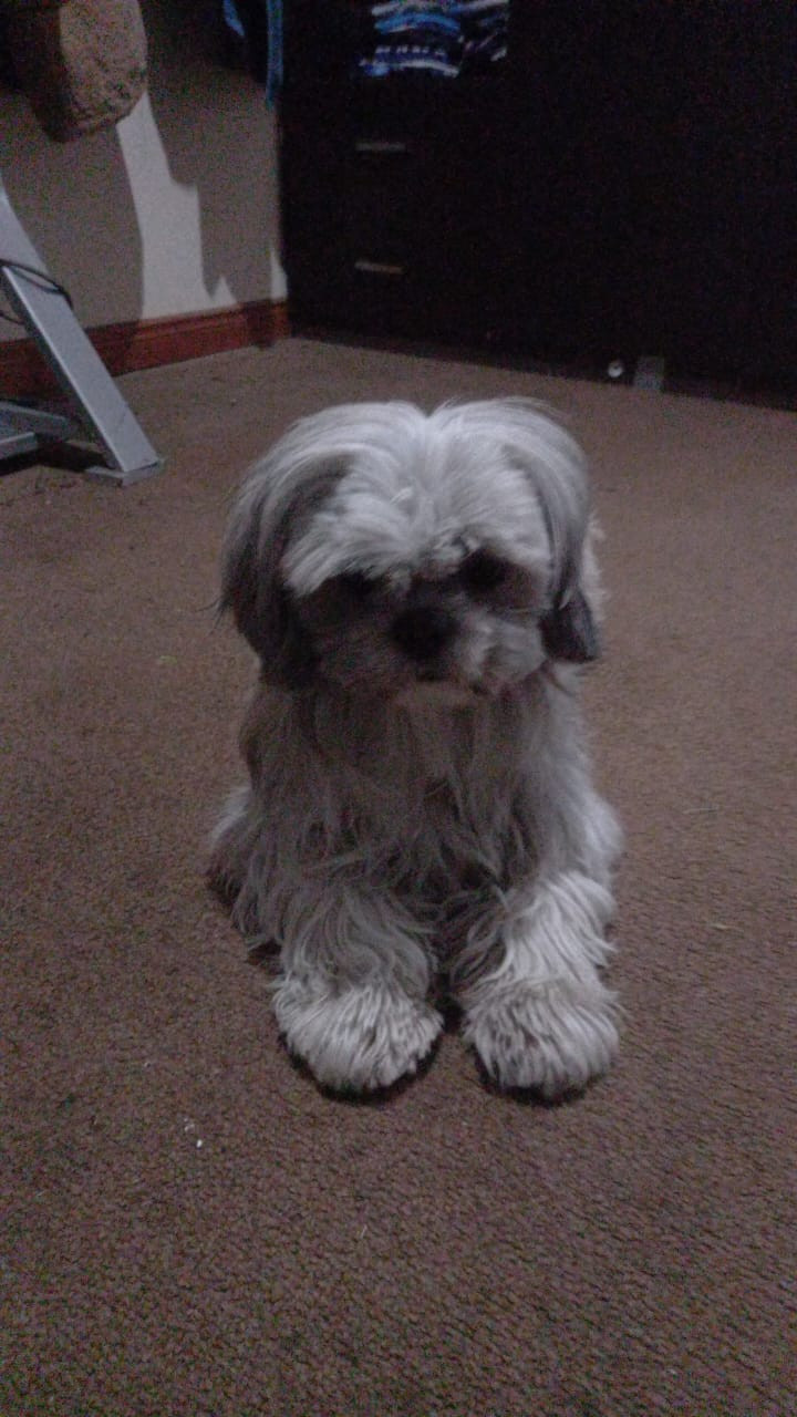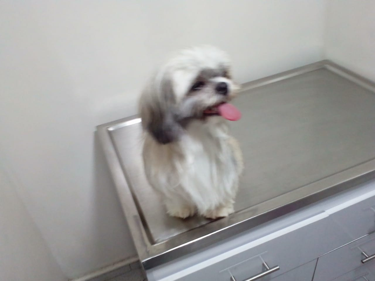 ✅ Es un perrito de raza shih tzu, es blanco con gris clarito.