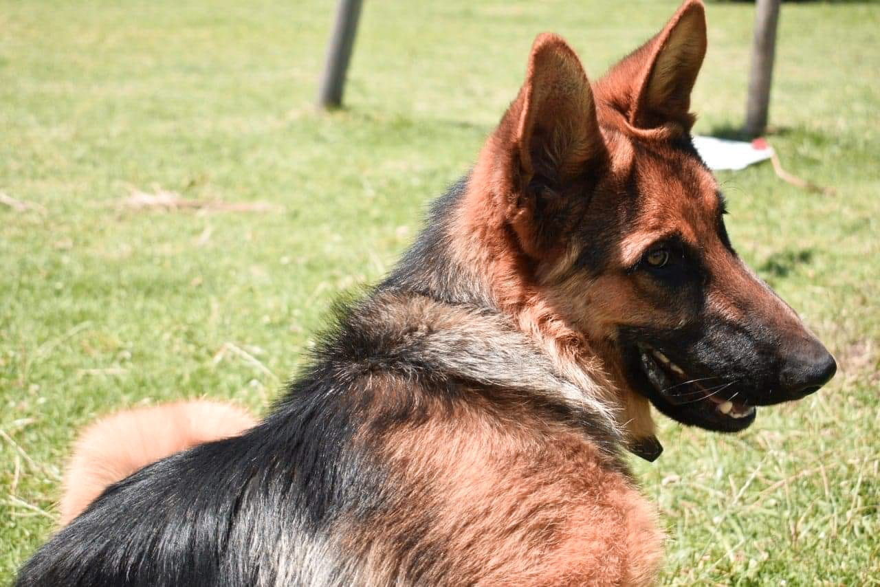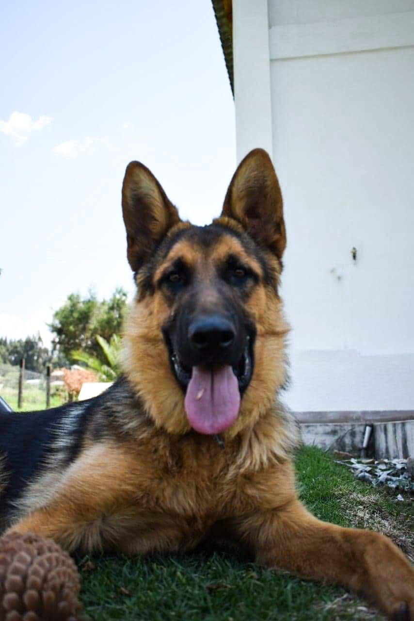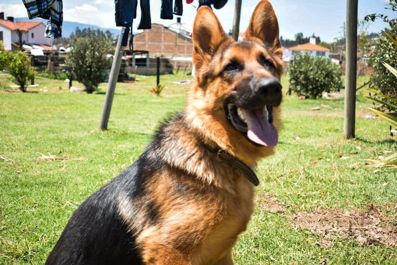 ✅ Es un perro grande de raza Pastor Alemán, de orejas paradas, cola emplumada, color negro con amarllo, gordo, es muy alegre.
