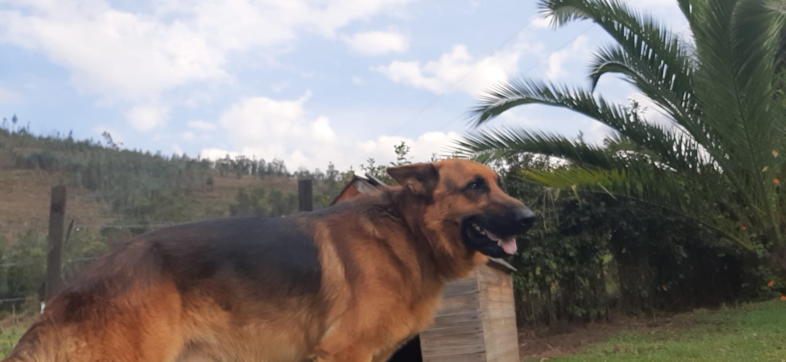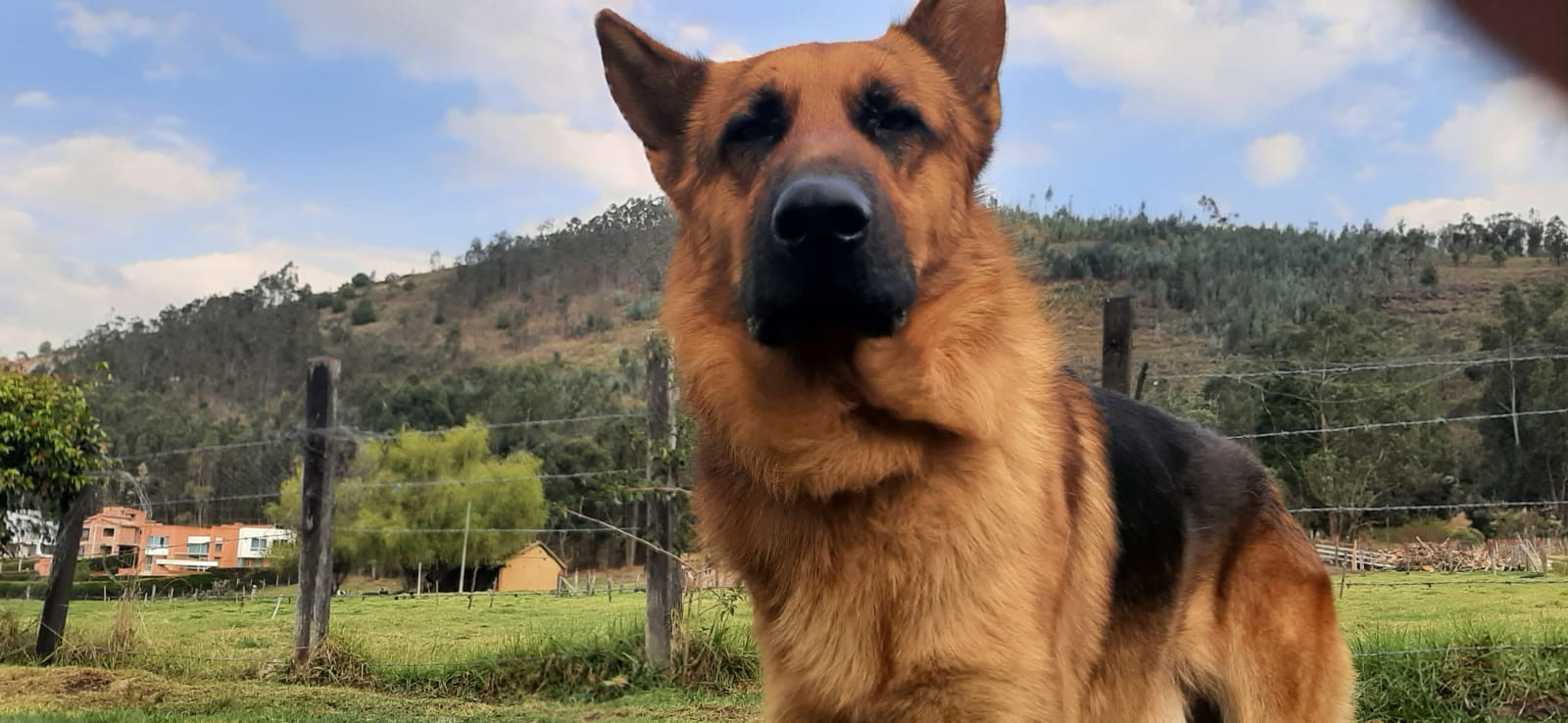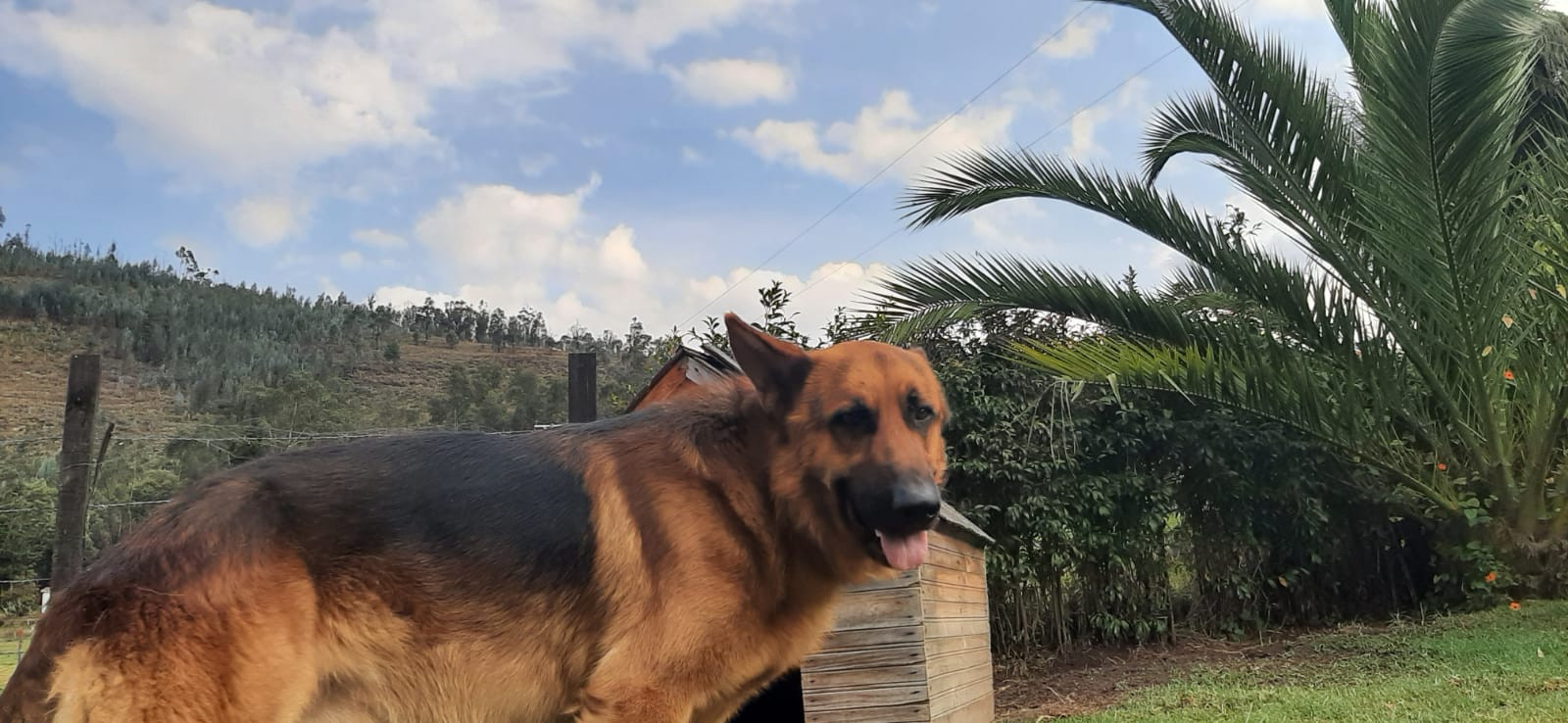 ✅ Es un perro grande de raza Pastor Alemán, de orejas paradas, cola emplumada, color negro con amarllo, gordo, es muy alegre.