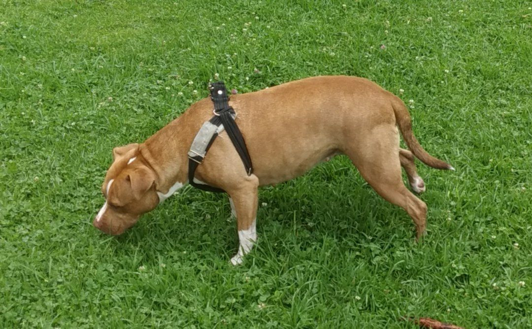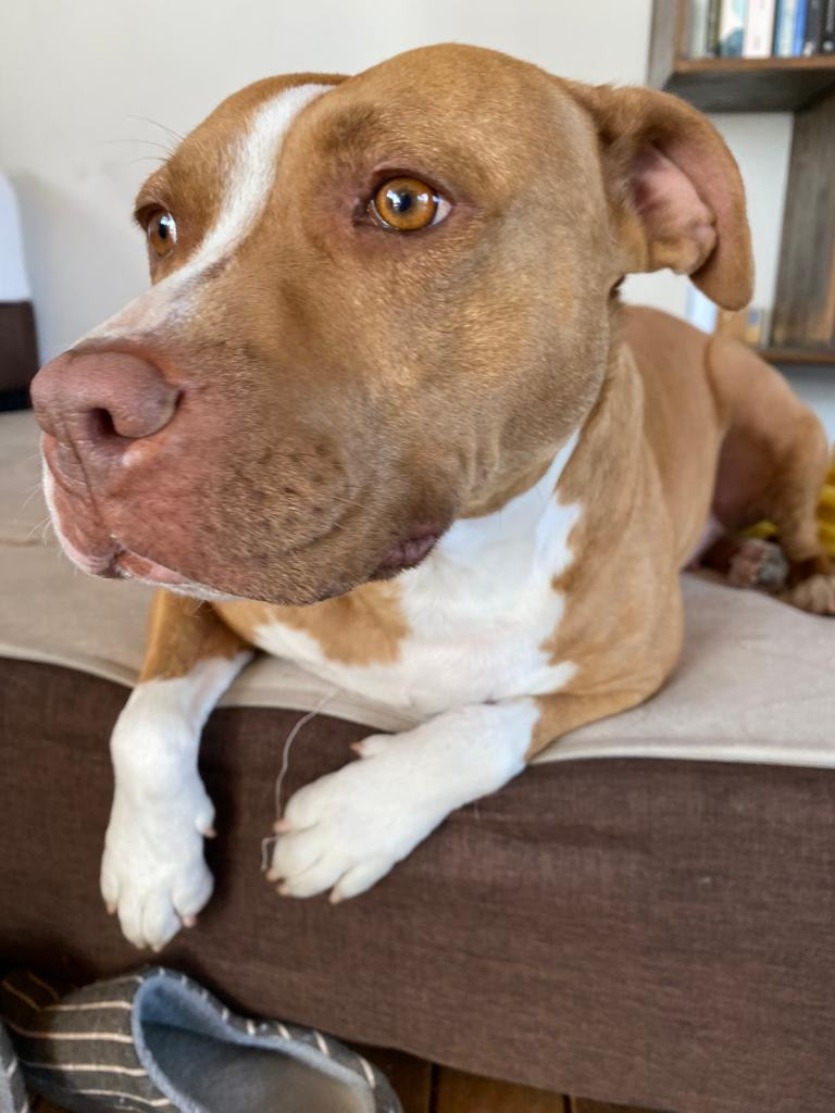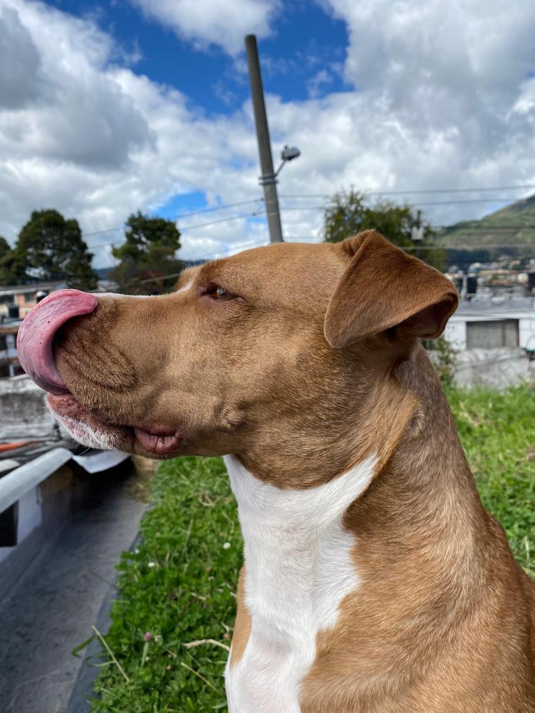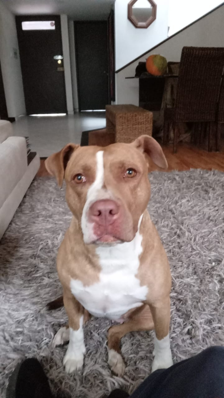 ✅ Es una perrita, hembra, de raza pitbul, es de color café con manchas blancas en el pecho, la cara y las patas.