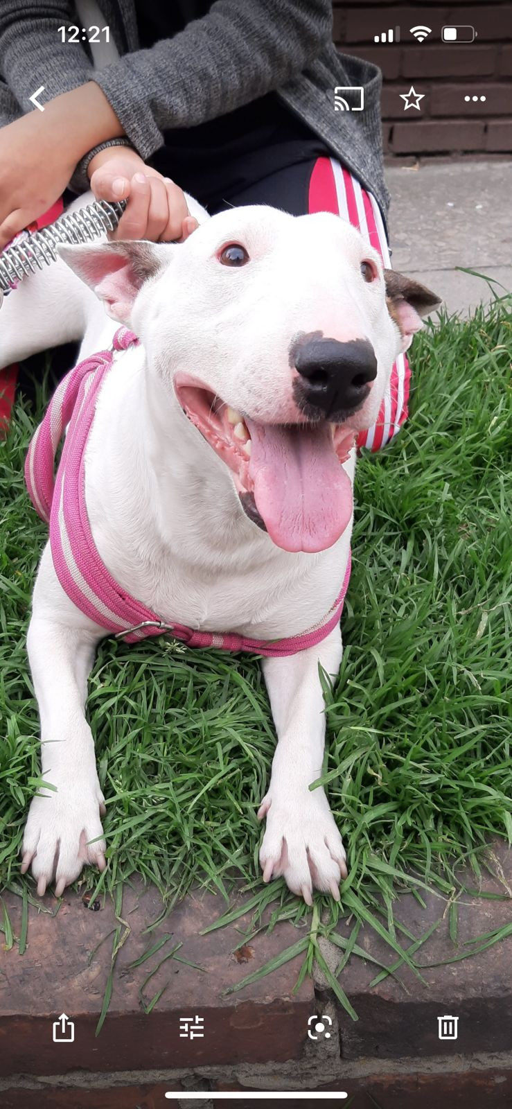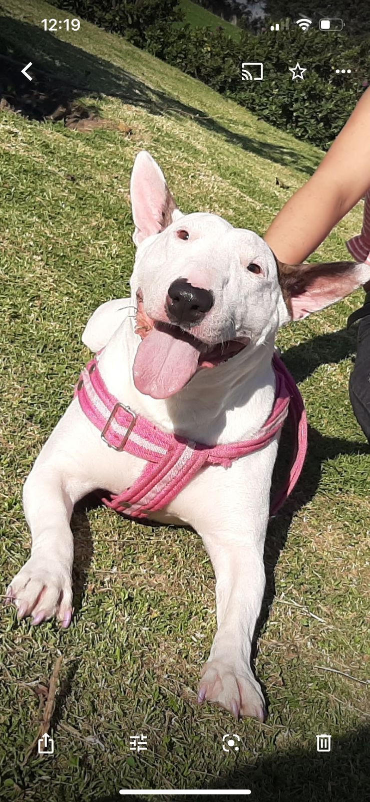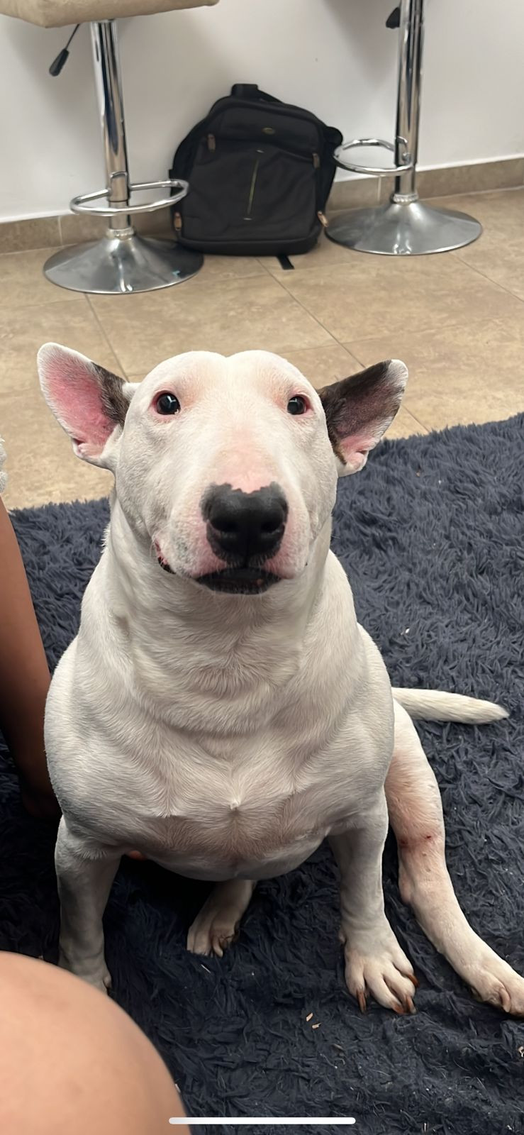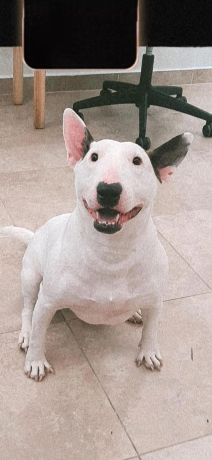 ✅ Es una perrita, hembra, de raza Bull terrier, es blanca, de contextura gruesa, la nariz en forma de corazón es negrita, tiene en la pata trasera izquierda cicatrices de una operación de hace años, tiene la oreja derecha color marrón y la otra es blanca con una mancha pequeñ , tiene tambien tiene una hernia en el centro de la pancita, en la oreja derecha tiene 3 manchitas verdes como de tatuaje ya que fue rescatada.