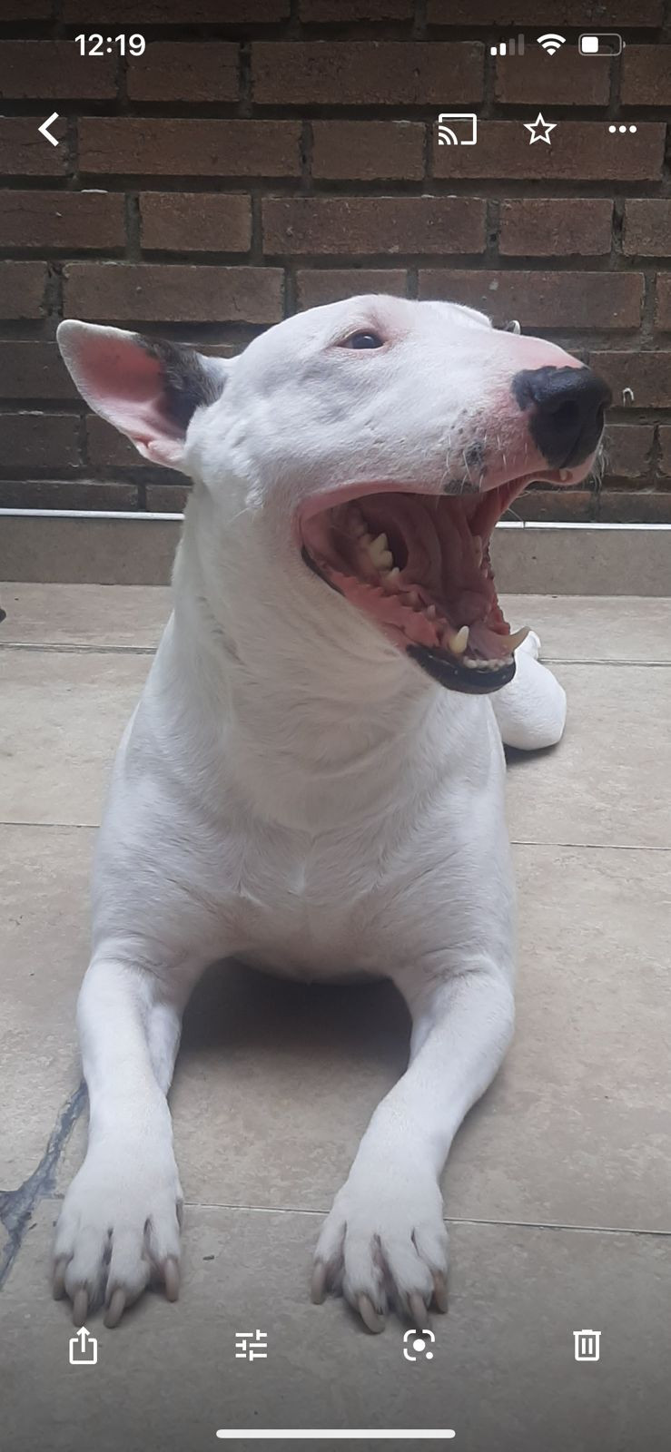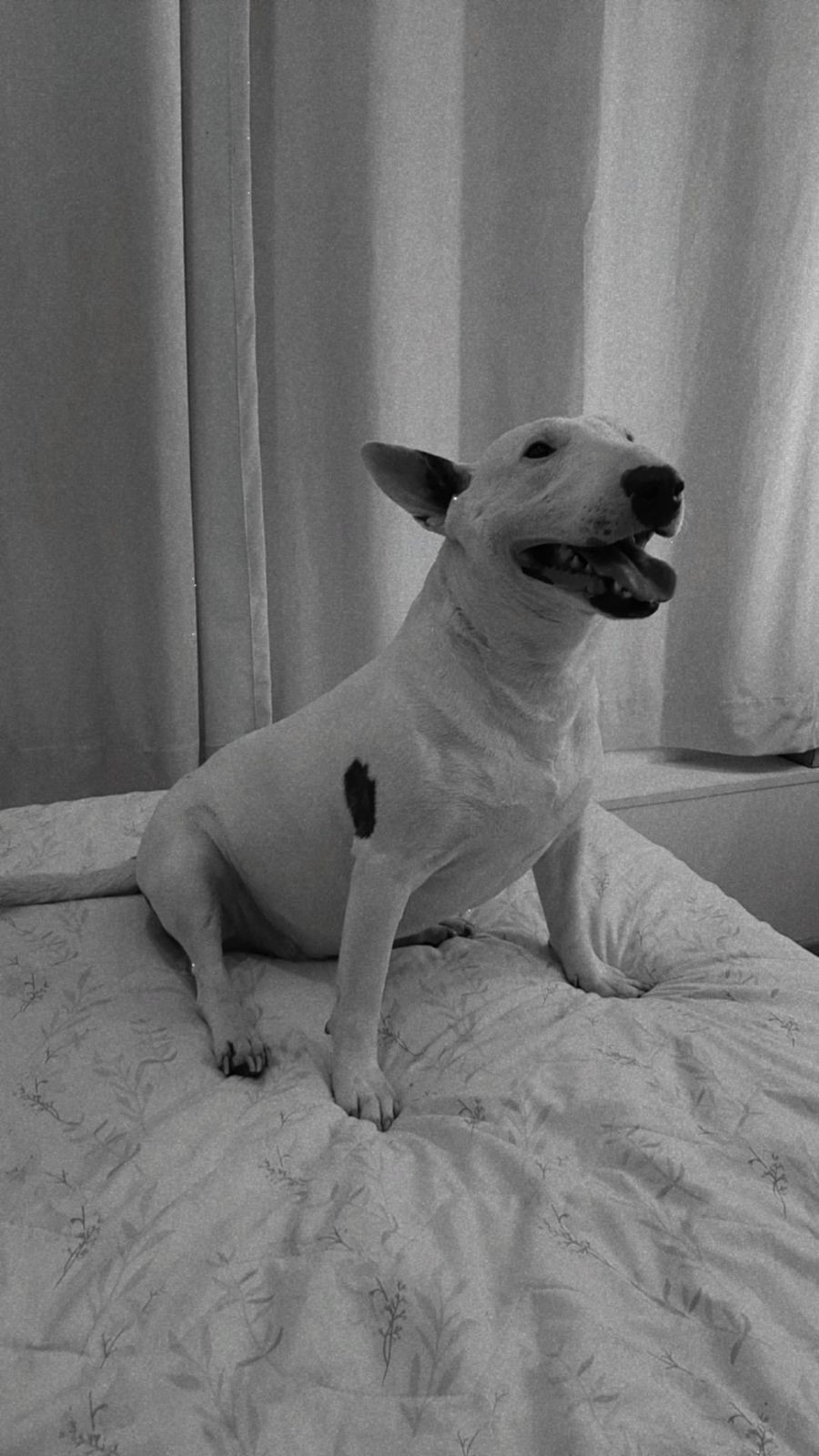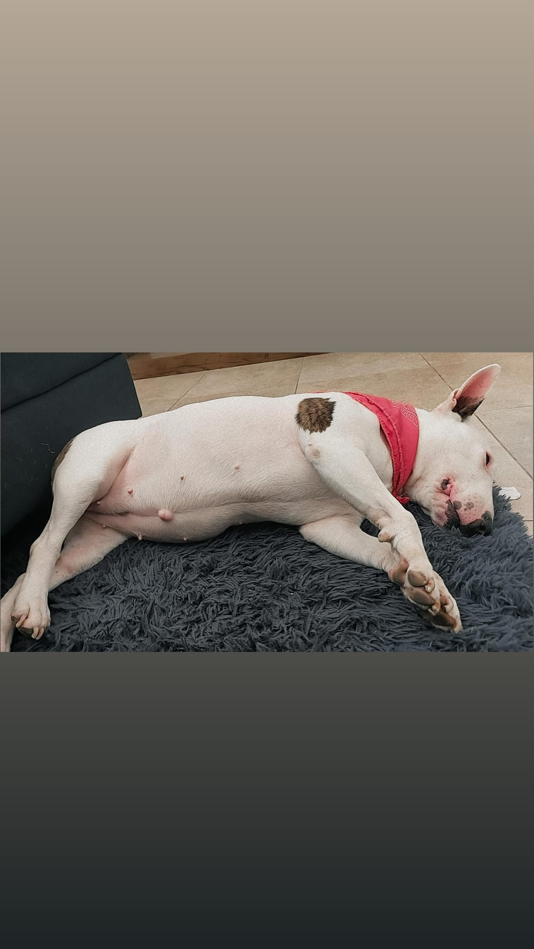 ✅ Es una perrita, hembra, de raza Bull terrier, es blanca, de contextura gruesa, la nariz en forma de corazón es negrita, tiene en la pata trasera izquierda cicatrices de una operación de hace años, tiene la oreja derecha color marrón y la otra es blanca con una mancha pequeñ , tiene tambien tiene una hernia en el centro de la pancita, en la oreja derecha tiene 3 manchitas verdes como de tatuaje ya que fue rescatada.