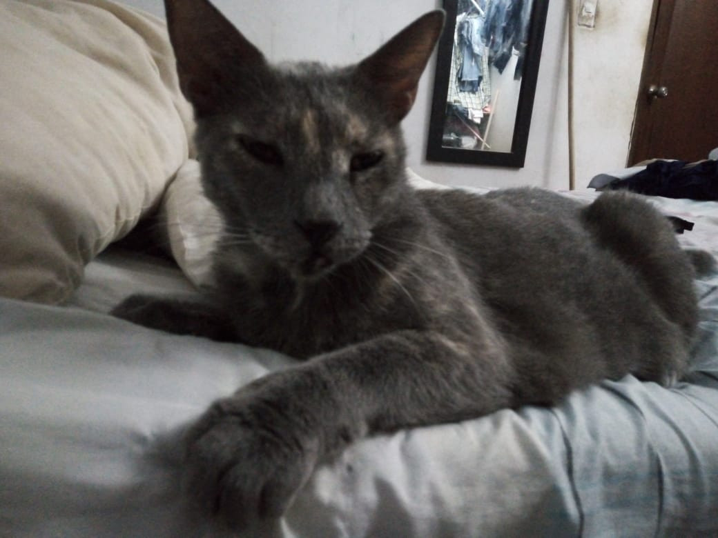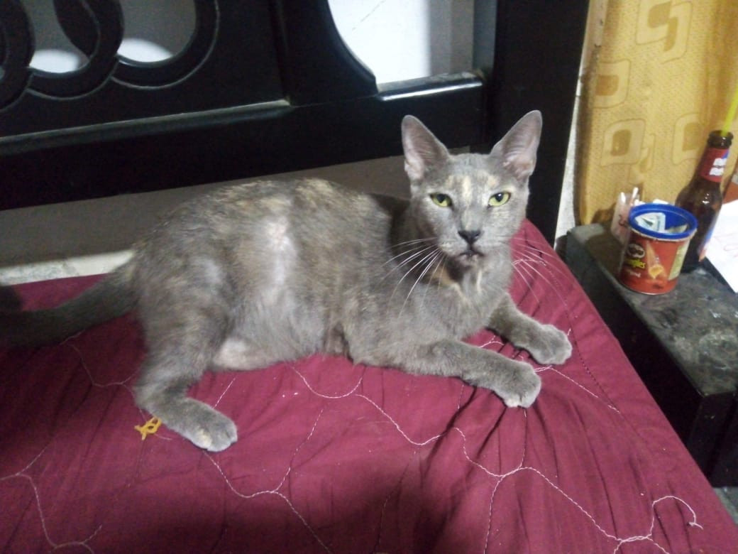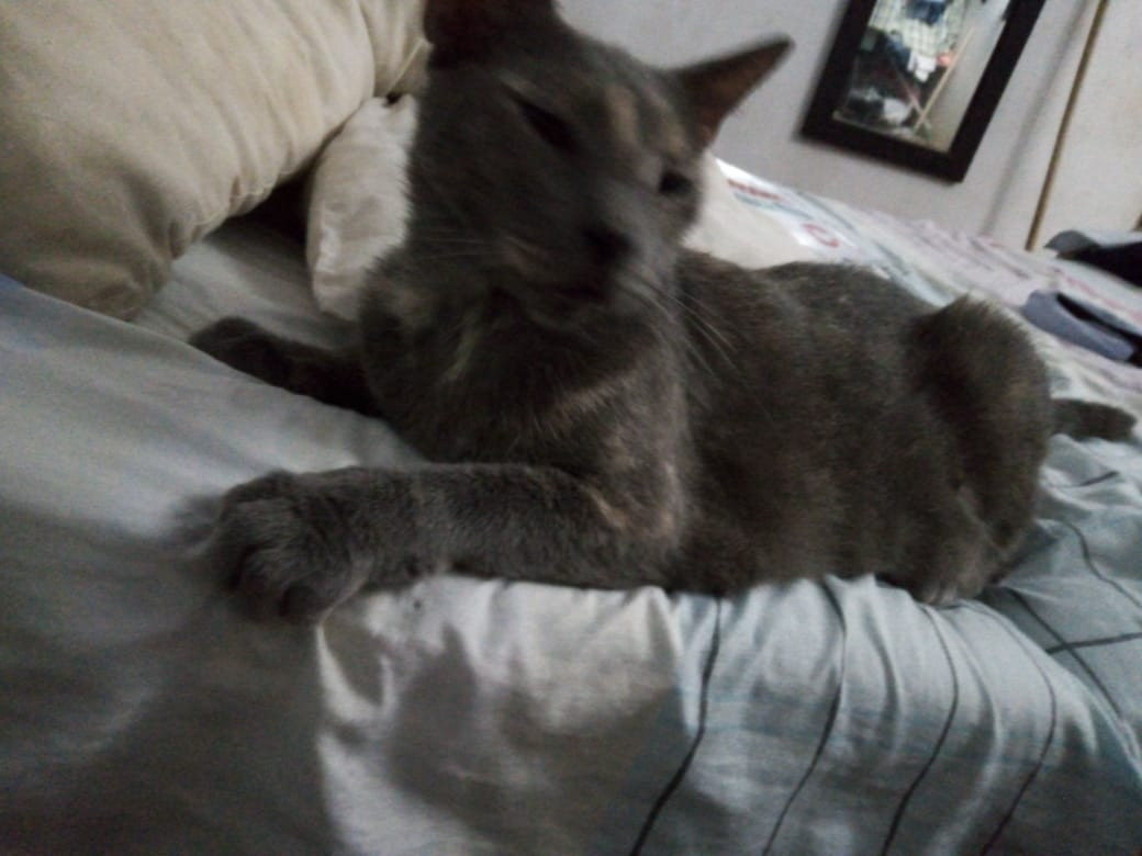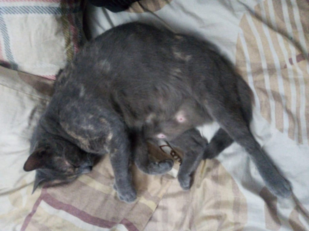 ✅ Tiene una cicatriz en el lomo, de una infección que tuvo y no le volvió a crecer pelo ahí, esta como si estuviera amantando, es color gris, con una mancha blanca en el pecho.