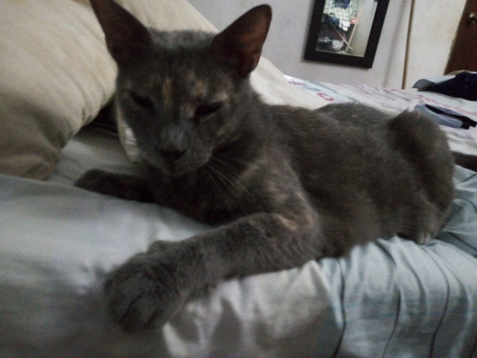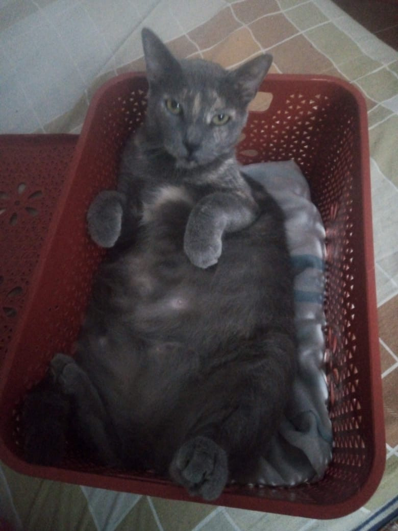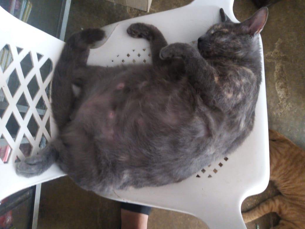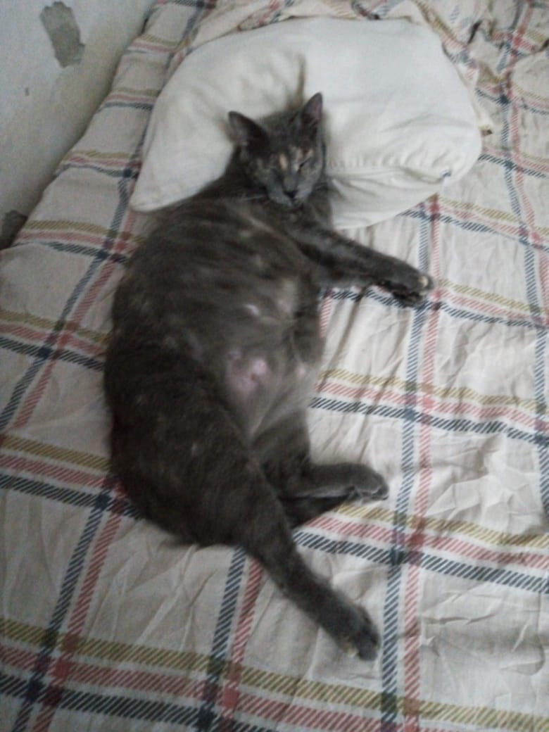✅ Tiene una cicatriz en el lomo, de una infección que tuvo y no le volvió a crecer pelo ahí, esta como si estuviera amantando, es color gris, con una mancha blanca en el pecho.