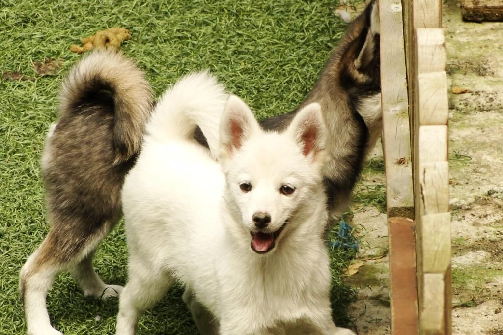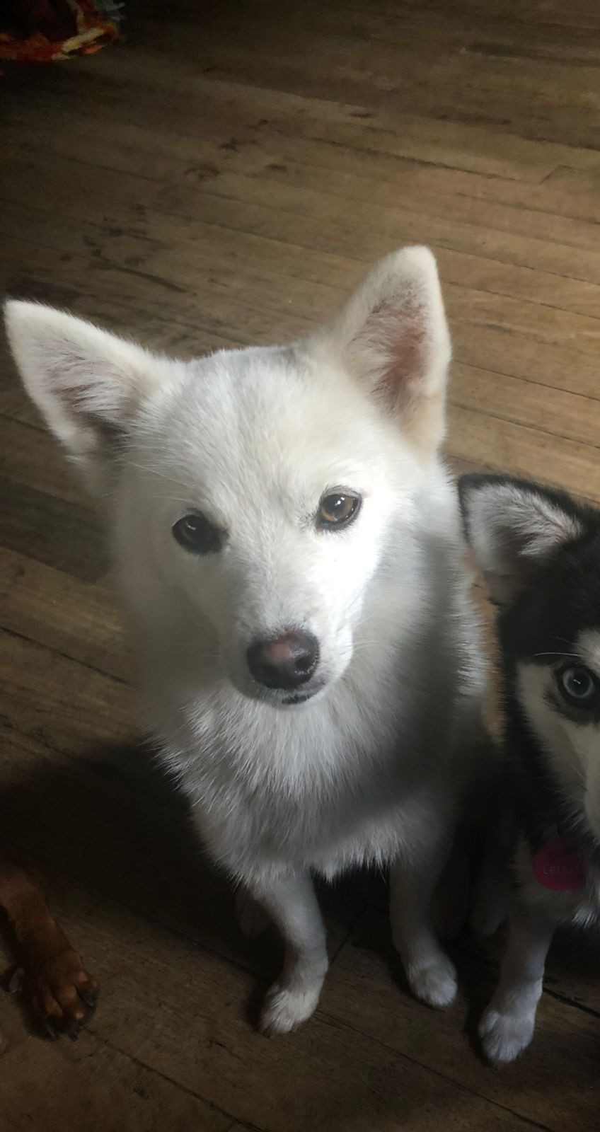✅ Es una perrita, hembra, raza pomski mini, es de color blanco y ojos café oscuros.
