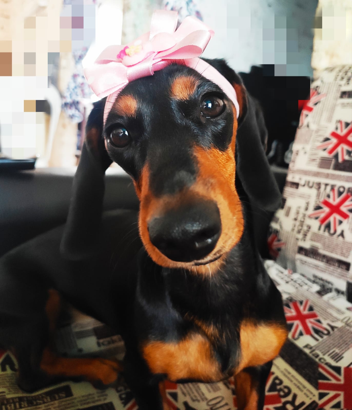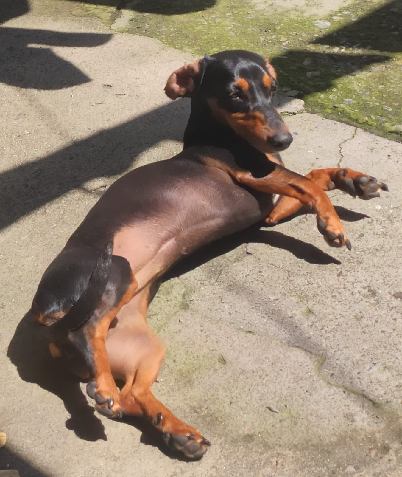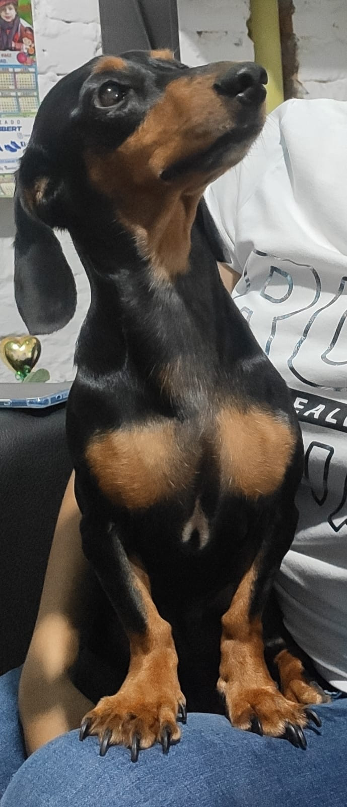 ✅ Es una perrita pequeña, color negro con manchas cafés, delgada de orejas largas.