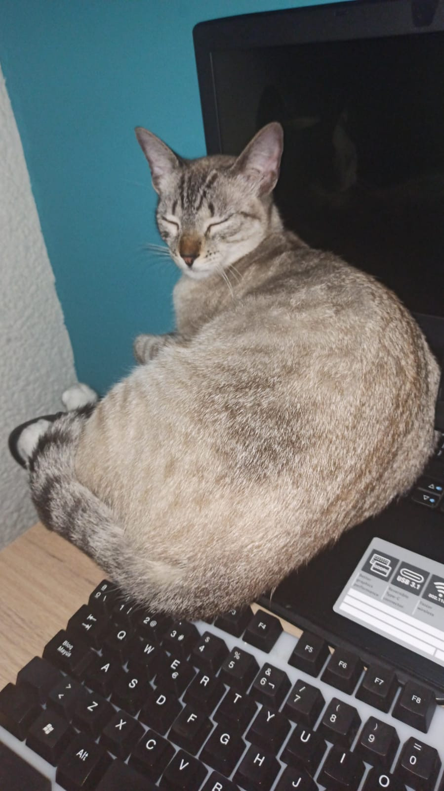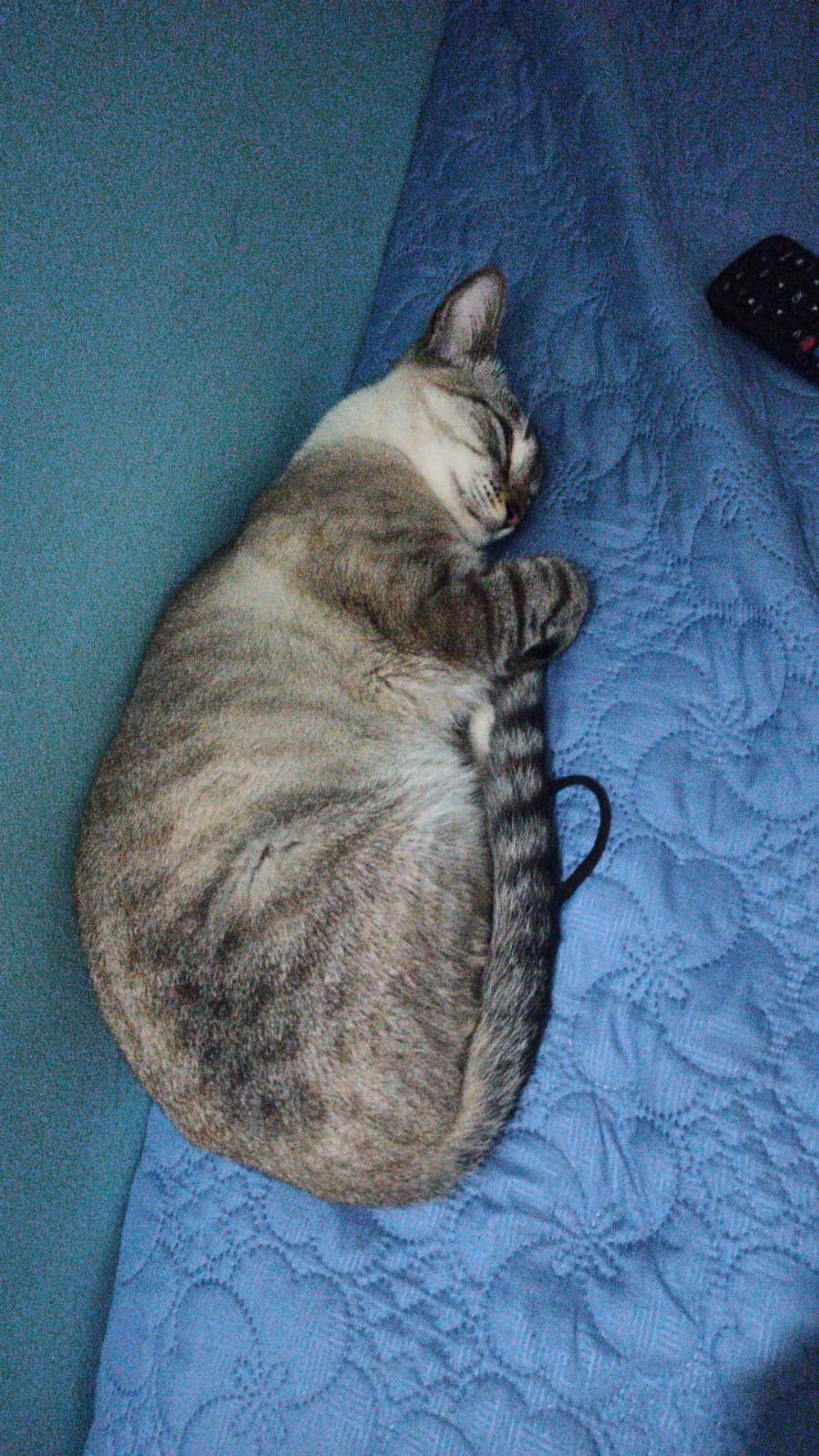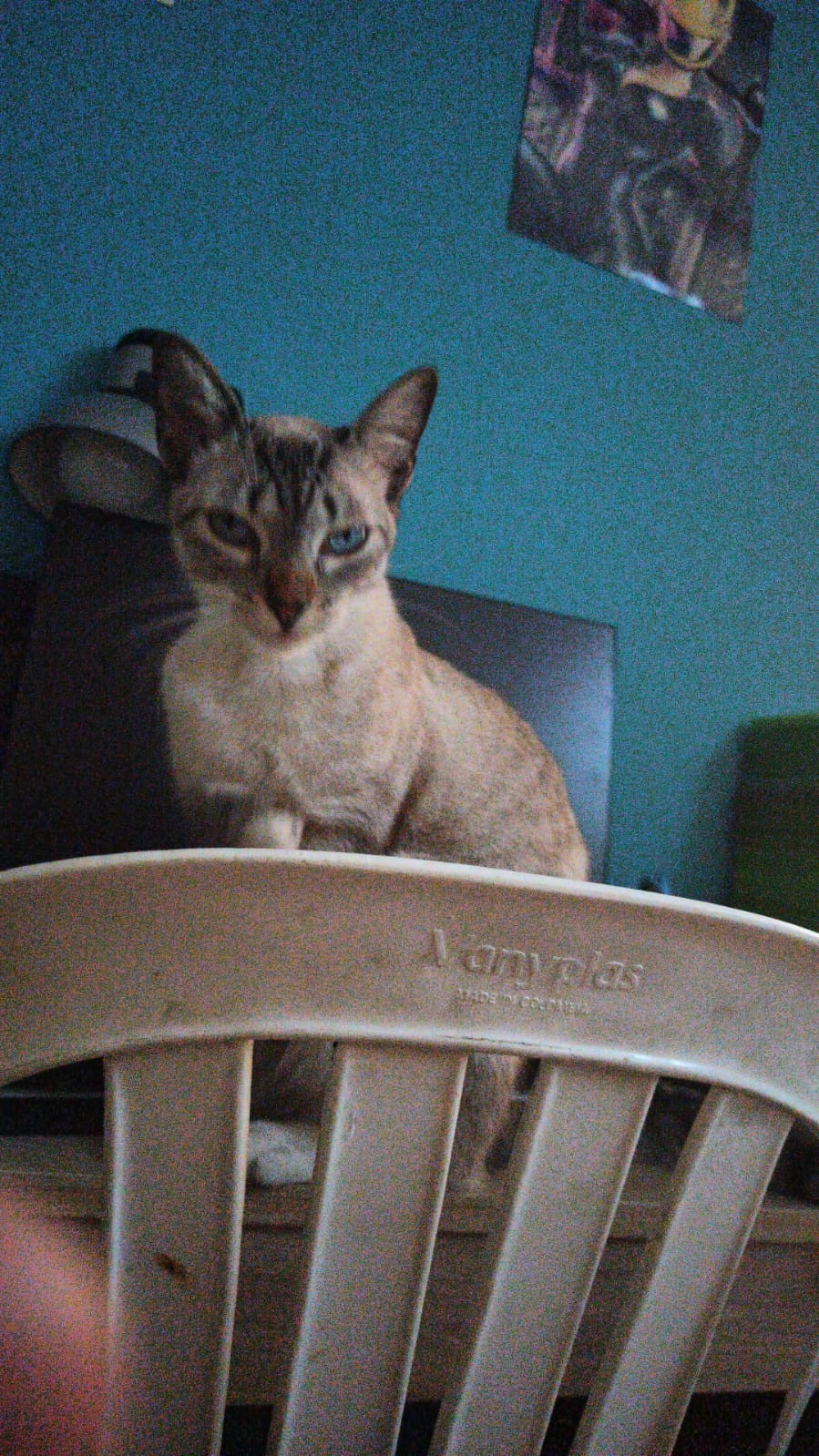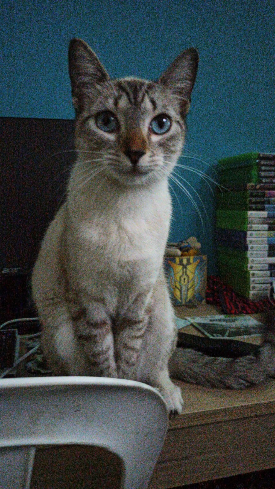 ✅ Es una gatita siamés con criollo, color gris con patas traseras blancas, una m en la cara y sus ojos son azules.