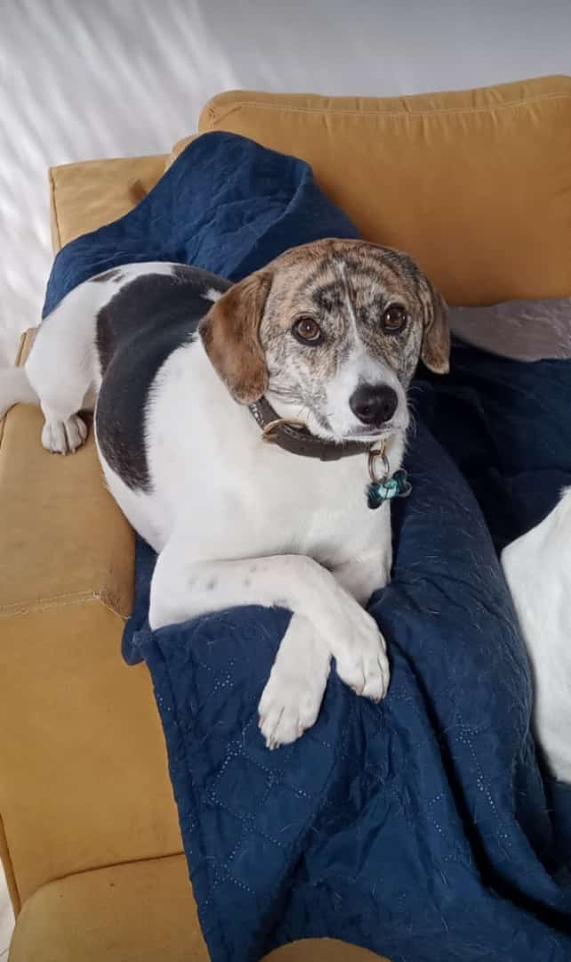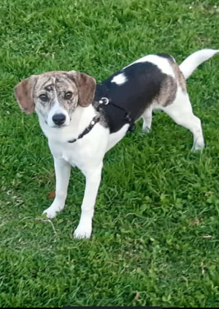 ✅ Es un perrito de tamaño, mediano - pequeño es blanco con manchas en el cuerpo y en la cara y en la frente.