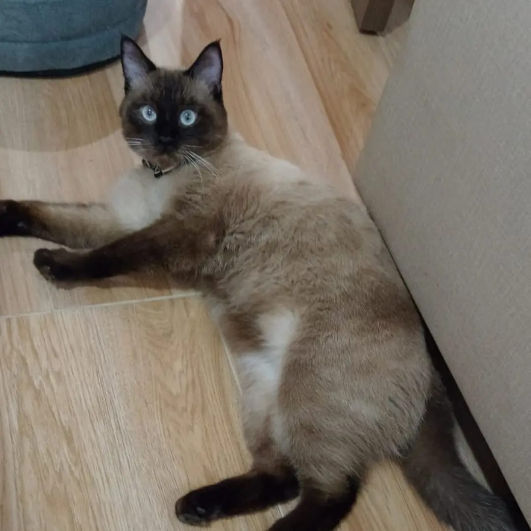 ✅ Es un gato de ojos azules, es cafecito típicamente siames, es delgado.