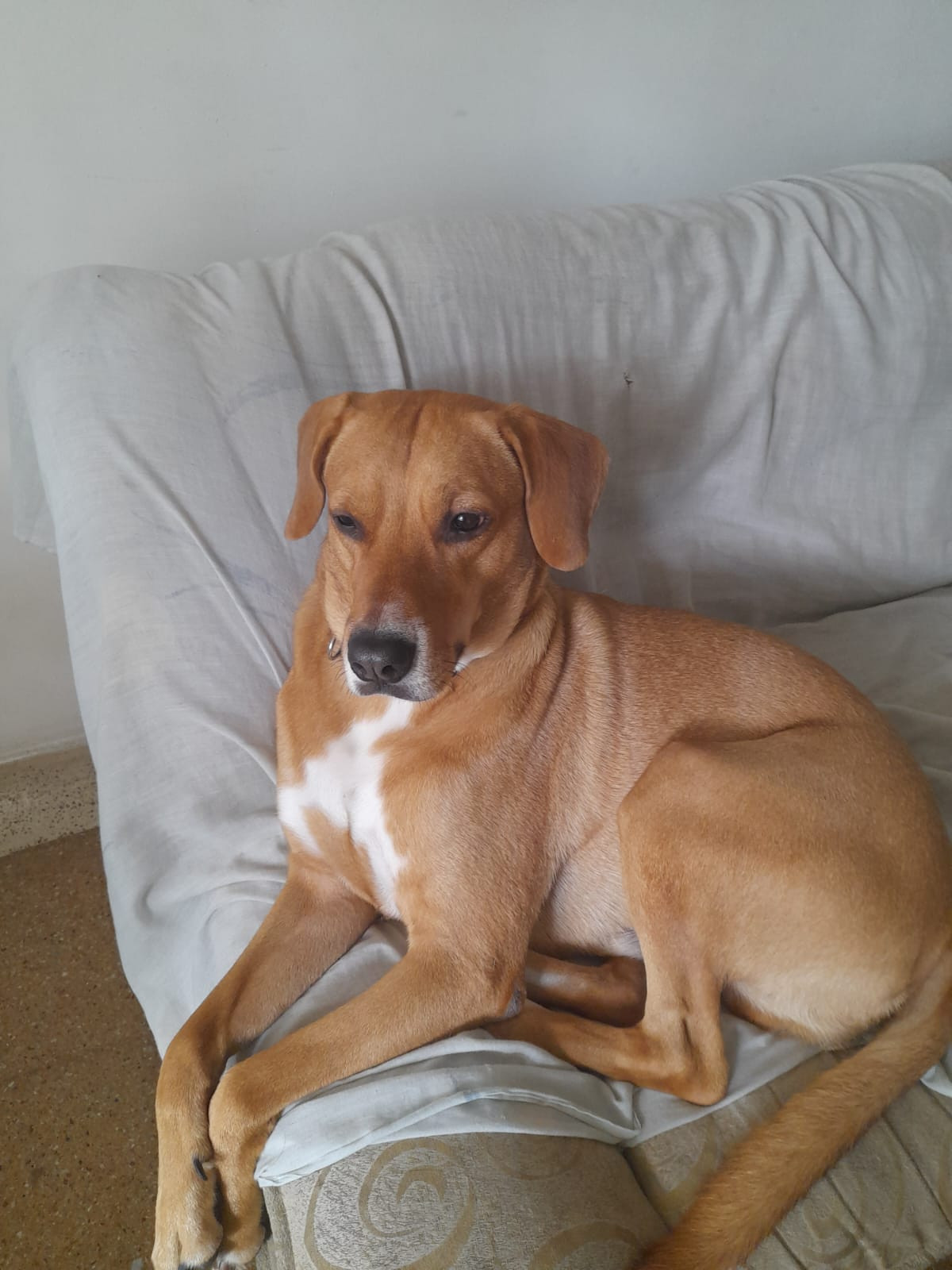 ✅ Es un perrito de pelaje mono-dorado. Talla mediana. Mancha blanca en su torso, en la punta de sus patas y alrededor del hocico.