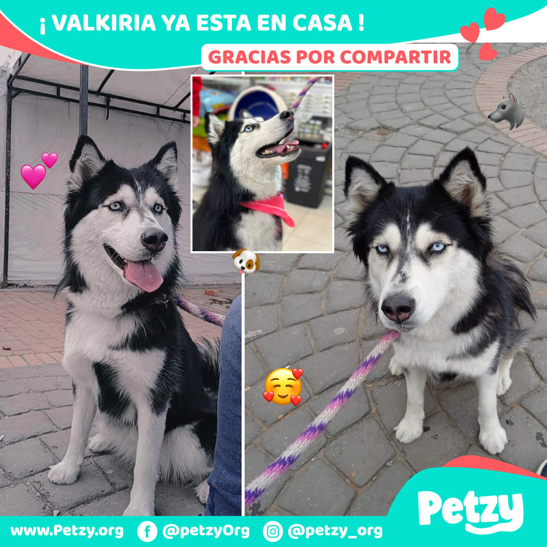 Valkiria se habia perdido en Soacha, Cundinamarca Barrio el trébol, sector terreros el dia jueves 5 de enero de 2023. Valkiria es Perrita peluda, blanca con negro, ojos azules, en medio de las 2 orejas tiene una protuberancia cómo chichón. Su cola es muy erguida y muy peluda o esponjada.Cuando se perdió tenía una pañoleta rosada