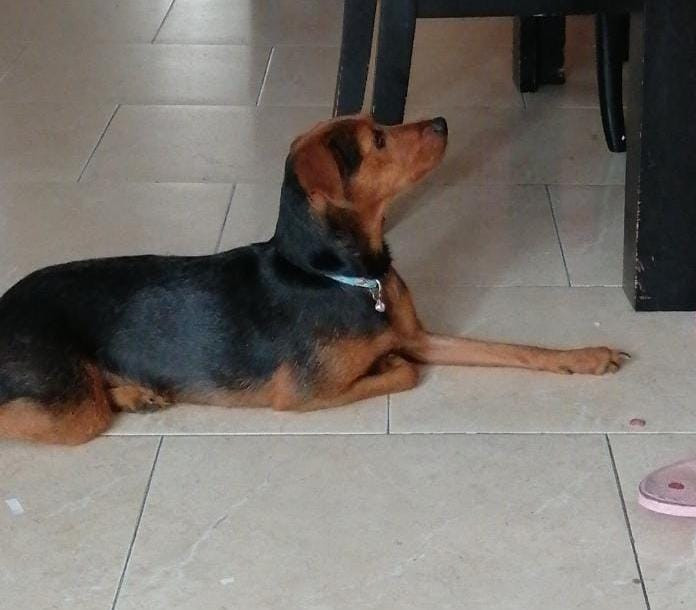 Abby se habia perdido en Cúcuta, BARRIO QUINTA BOCH el dia . Abby es Es una perrita, criolla, hembra, tiene las patas largas y delgadas, es de tamaño pequeño mediano, no es tan baja como un pincher, su cuerpo es delgado, tiene dos tonalidades negro y marrón, la nariz es de color negro, el pelito alrededor del cuello es de color negro como en forma de collar, los ojos son de color marrón clarito, casi color miel de mirada inocente, alrededor de sus ojos es negro, como si tuviera delineado, es inofensiva y muy casera, hace poco tuvo bebés. En el momento que se extravió NO tenía puesto ningún accesorio.