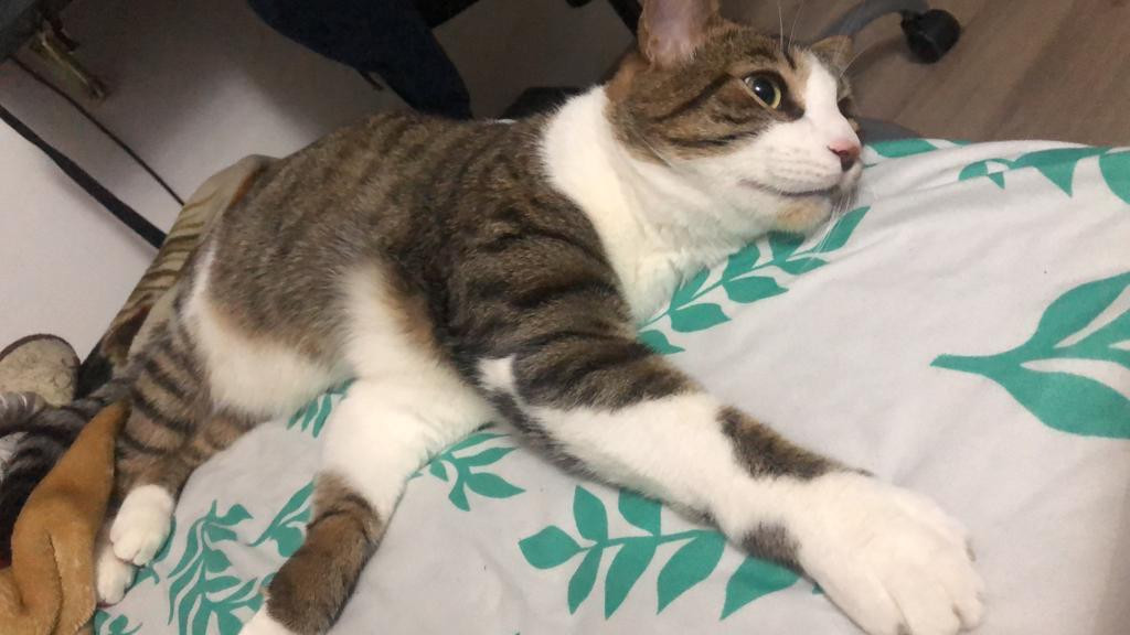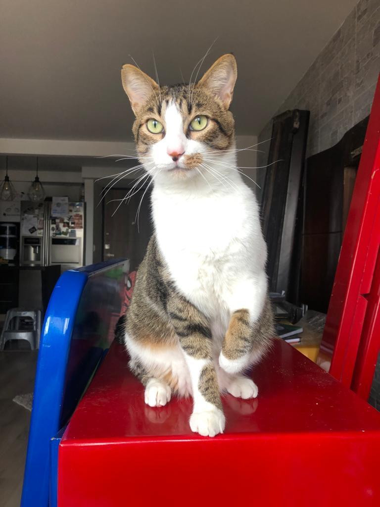 Atom se habia perdido en Bogota, San fernando, Edificio Nova 72 el dia domingo 22 de enero de 2023. Atom es Es un gato de tamaño mediano atigrado, pecho y patas blancas ojos verdes. En el momento que se extravió NO tenía puesto ningún accesorio.