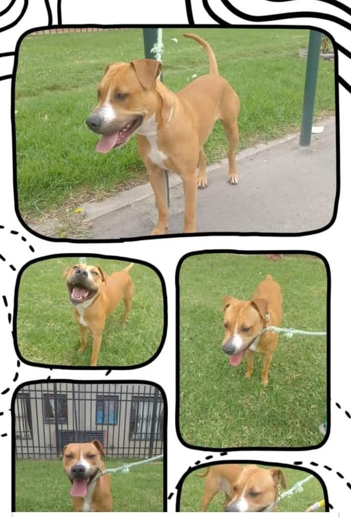 ✅ Es una perrita de un año de edad, enrazada con pitbull y criollo, su pelaje es corto, amarillo quemado, alta en peso balanceado.
