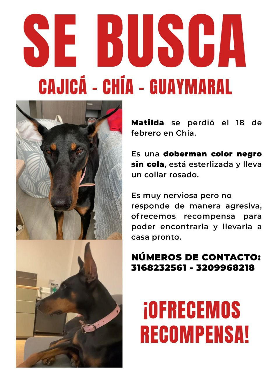 Se habia perdido en Chia, pasando el peaje el dia sábado 18 de febrero de 2023. Matilda es Es una perrita, hembra, raza Doberman, es de color negro y café; tiene algo muy característico en su cuello parte superior: tiene unos remolinos que hacen que su pelito esté al revés como si estuviera erizada siempre. Solo en su cuello. Es de caracter demasiado nerviosannSe cruzó la autopista y se metió a la vía nueva que están construyendo. Sentido opuesto del peaje. La vieron el domingo 19 de febrero entrando a Chia, antes de la universidad de la sabana, se metió por debajo del puente vehicular por donde quedaba un café que se llama Yerbabuena, potreros que dan a la carrilera del tren que llega a Cajica por la finca del Presidente y vía que sale a Yerbabuena, Sindamanoy y todos esos conjuntos.Cuando se perdió tenía un collar rosado pastel