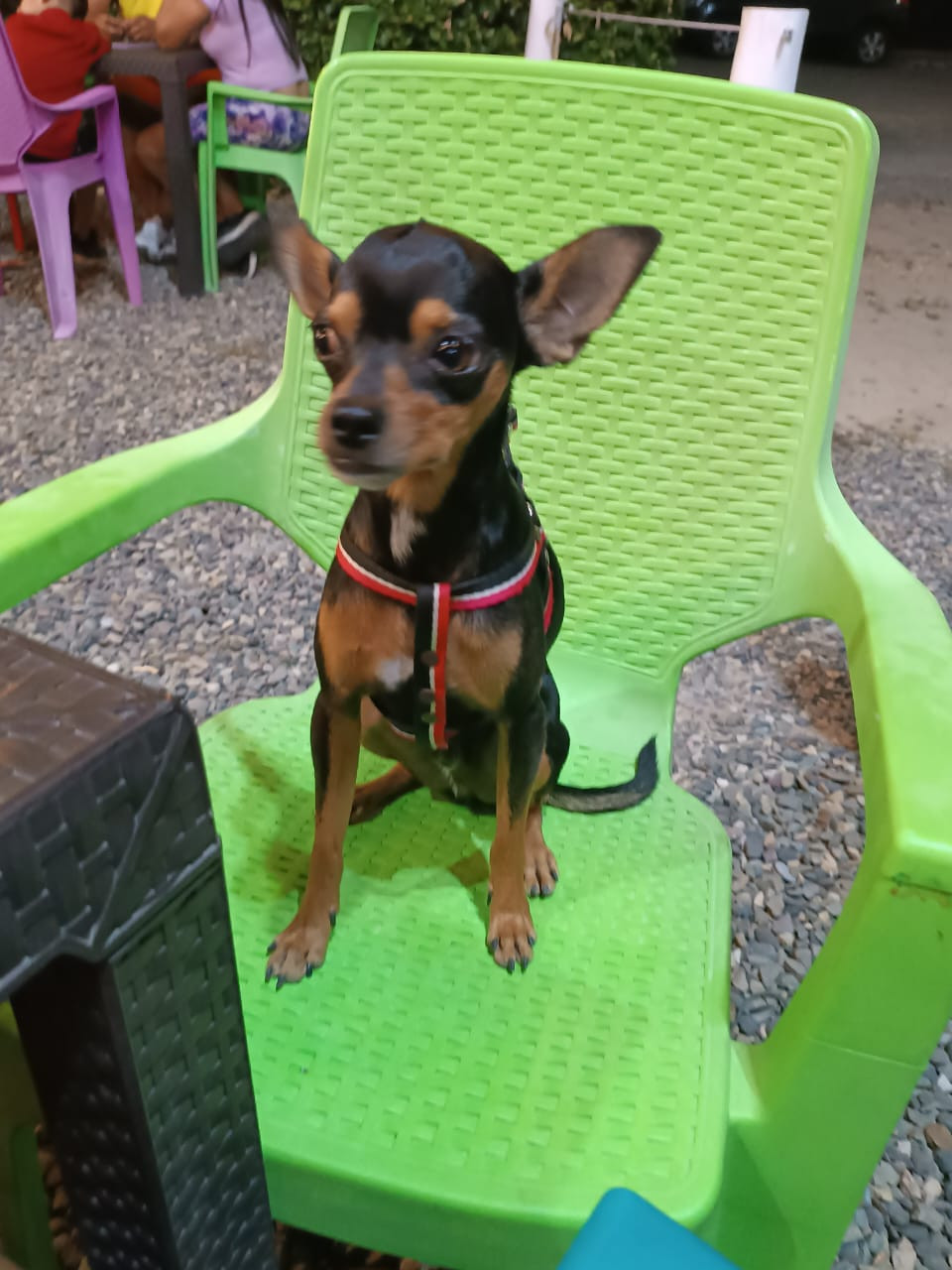 ✅ Es un perrito Pincher color negro con manchitas cafés en arriba de los ojos, tiene la colita larga y es pequeño.