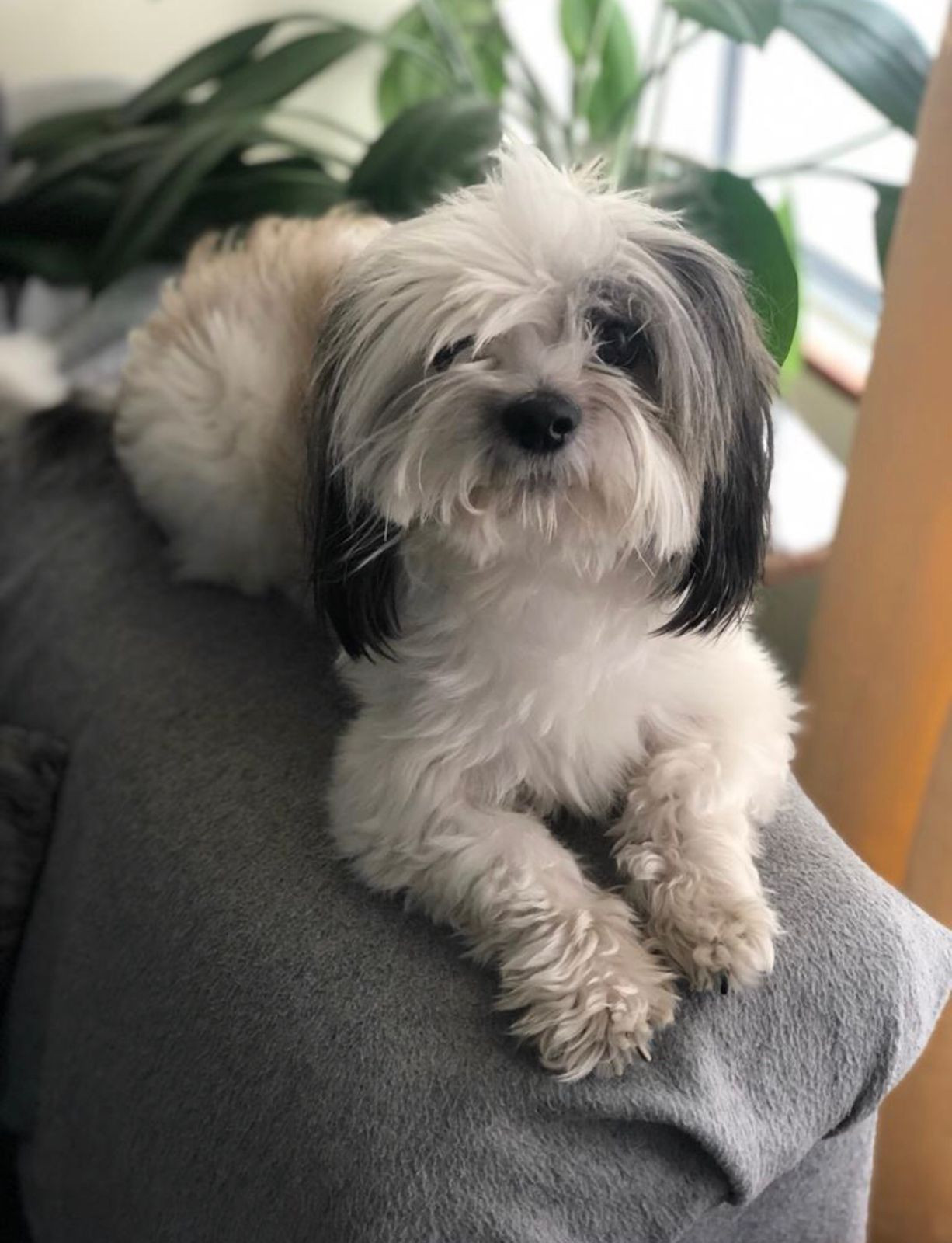 ✅ Es un perrito muy pequeño, blanco y gris, pelo un poco largo tal cual cómo está en la foto.