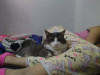 ✅ Es un gato gris con destellos monitos y tiene blancas la patitas, el pecho, y parte de la carita las mejillas y la naricita hacia abajo es blanco es muy peludo parece angora por el pelito la cola es gris también y muy peluda.