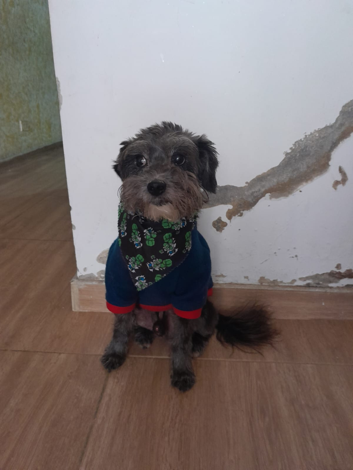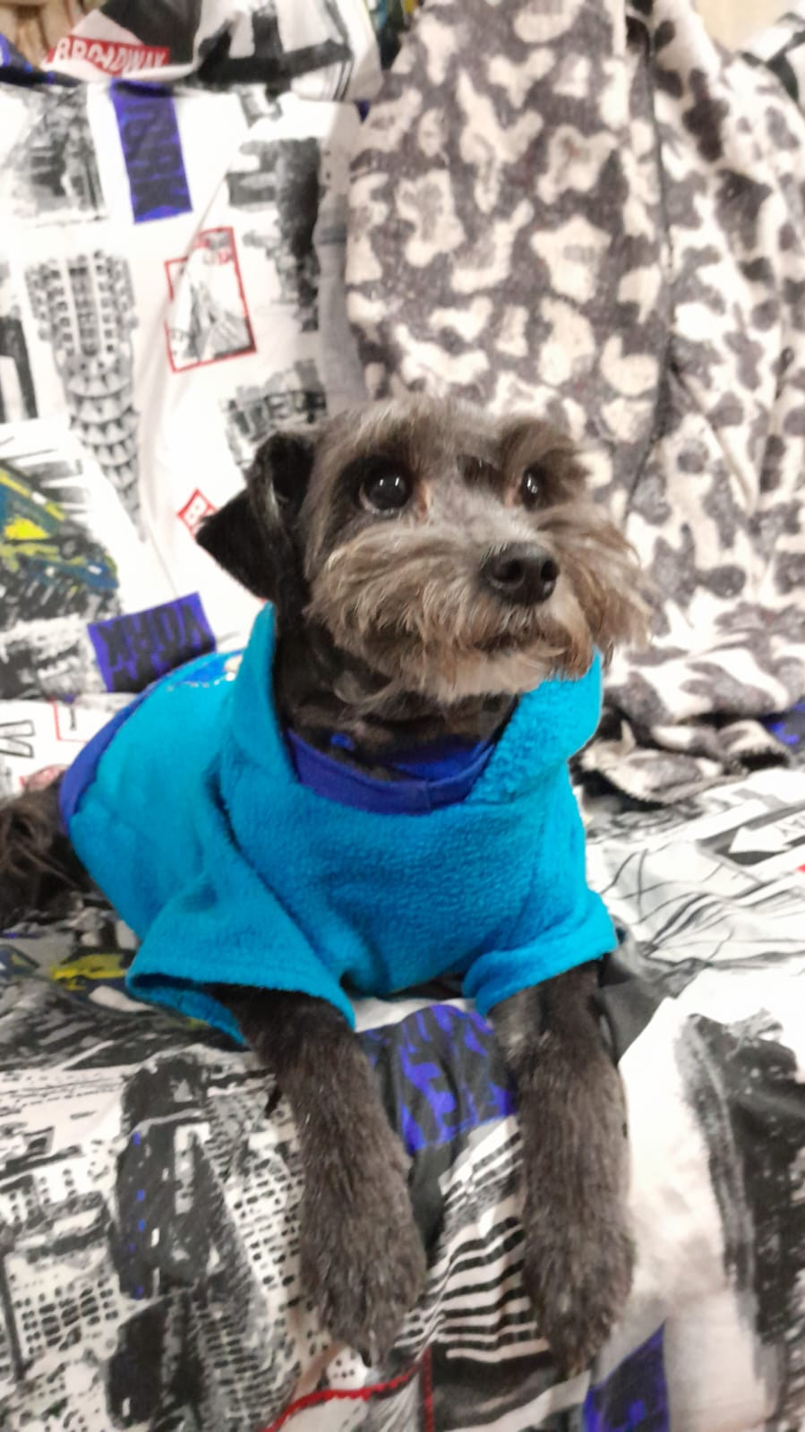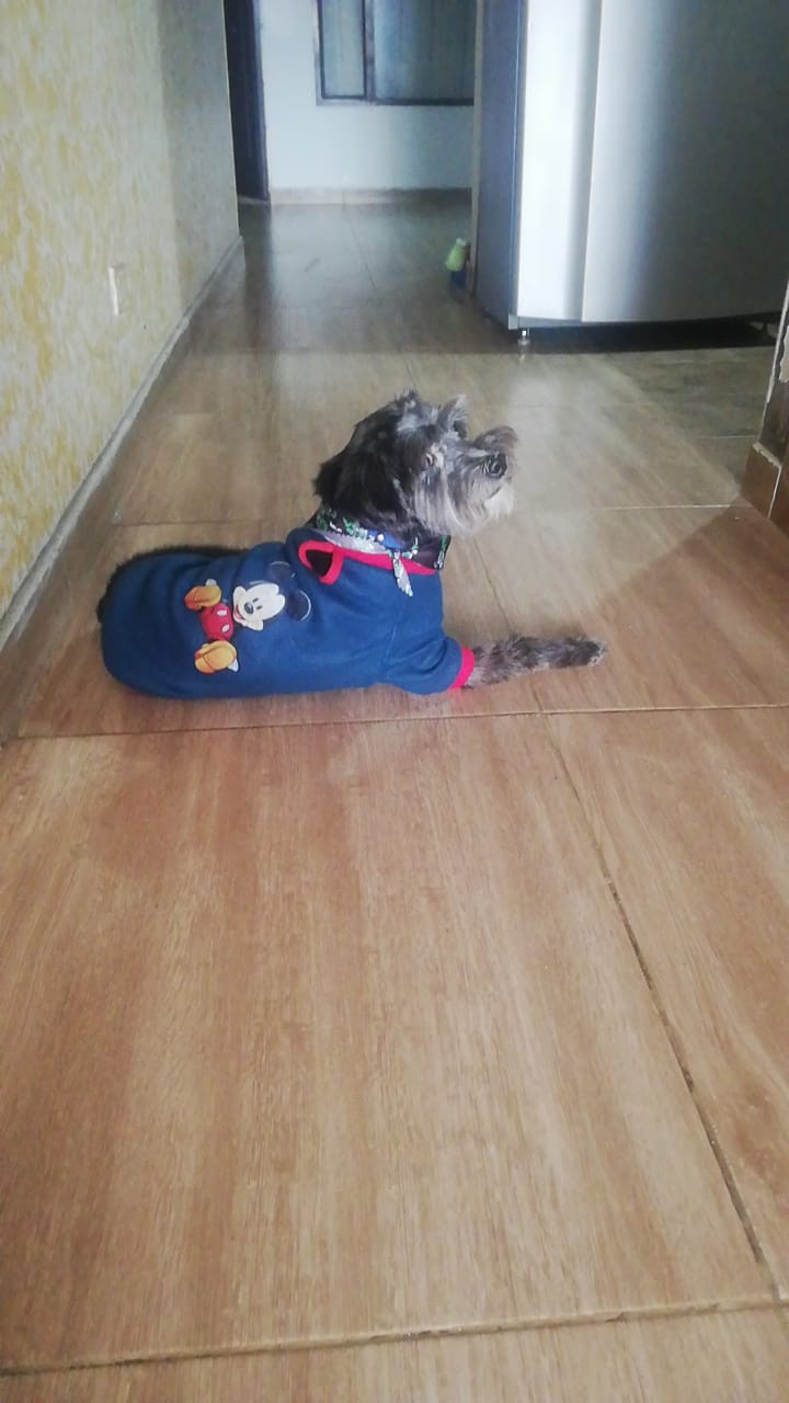 ✅ En el momento que se extravió tenía puesto Saco azul con un estampado de mickey mouse pañoleta negra con estampados verdes y collar gris con borde azul.