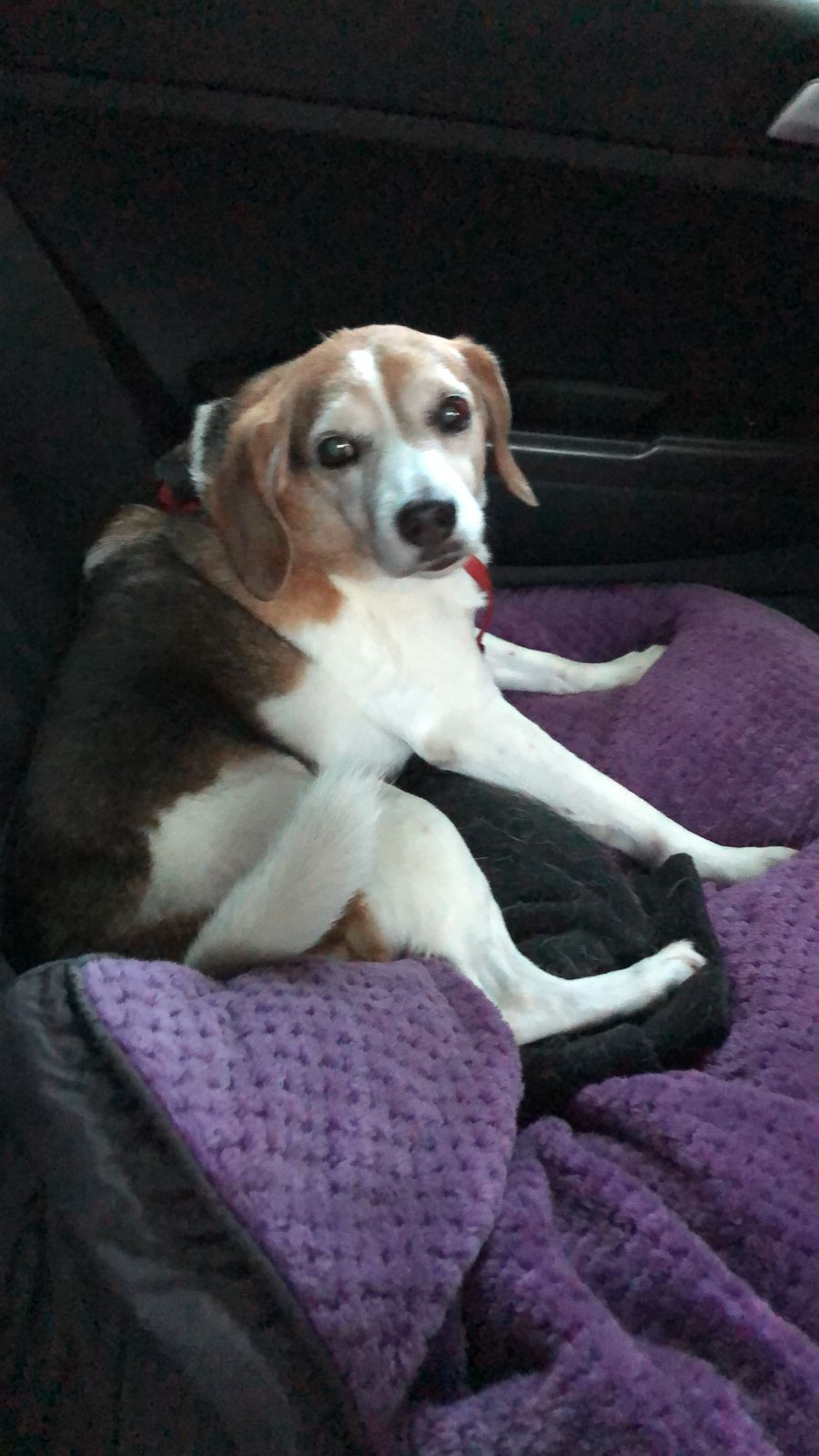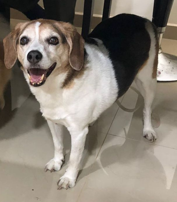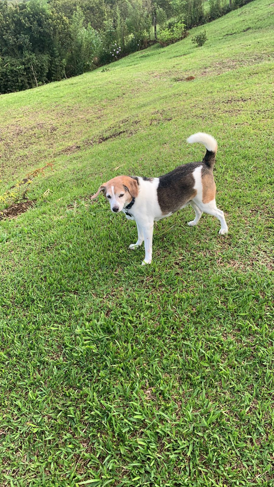 ✅ Es un perrito, macho, cruce de Beagle con Jack Russell, de estatura mediana, es blanco con una mancha negra grande y pequeñas manchas cafés. Su cabeza es color café claro.