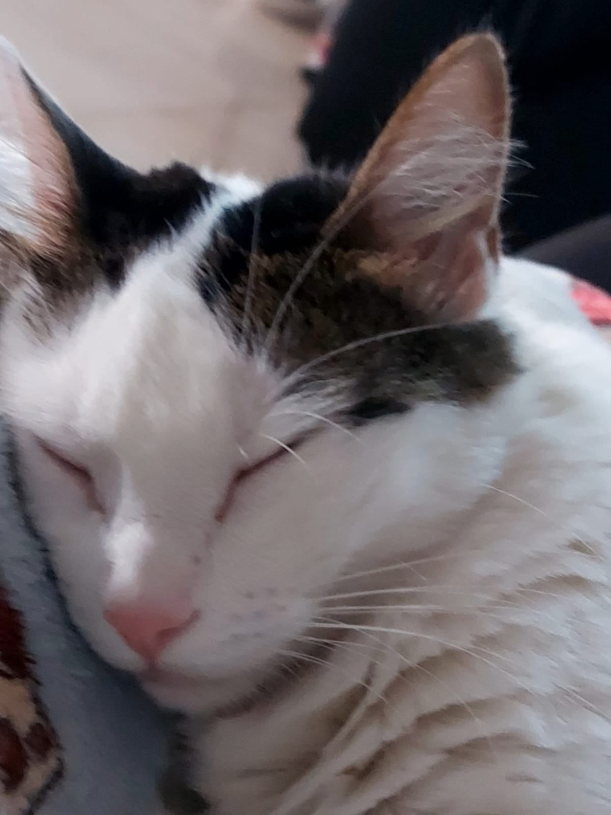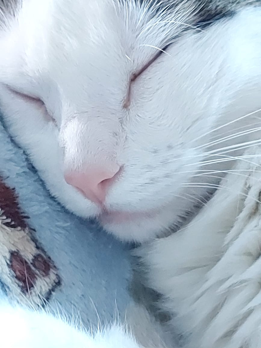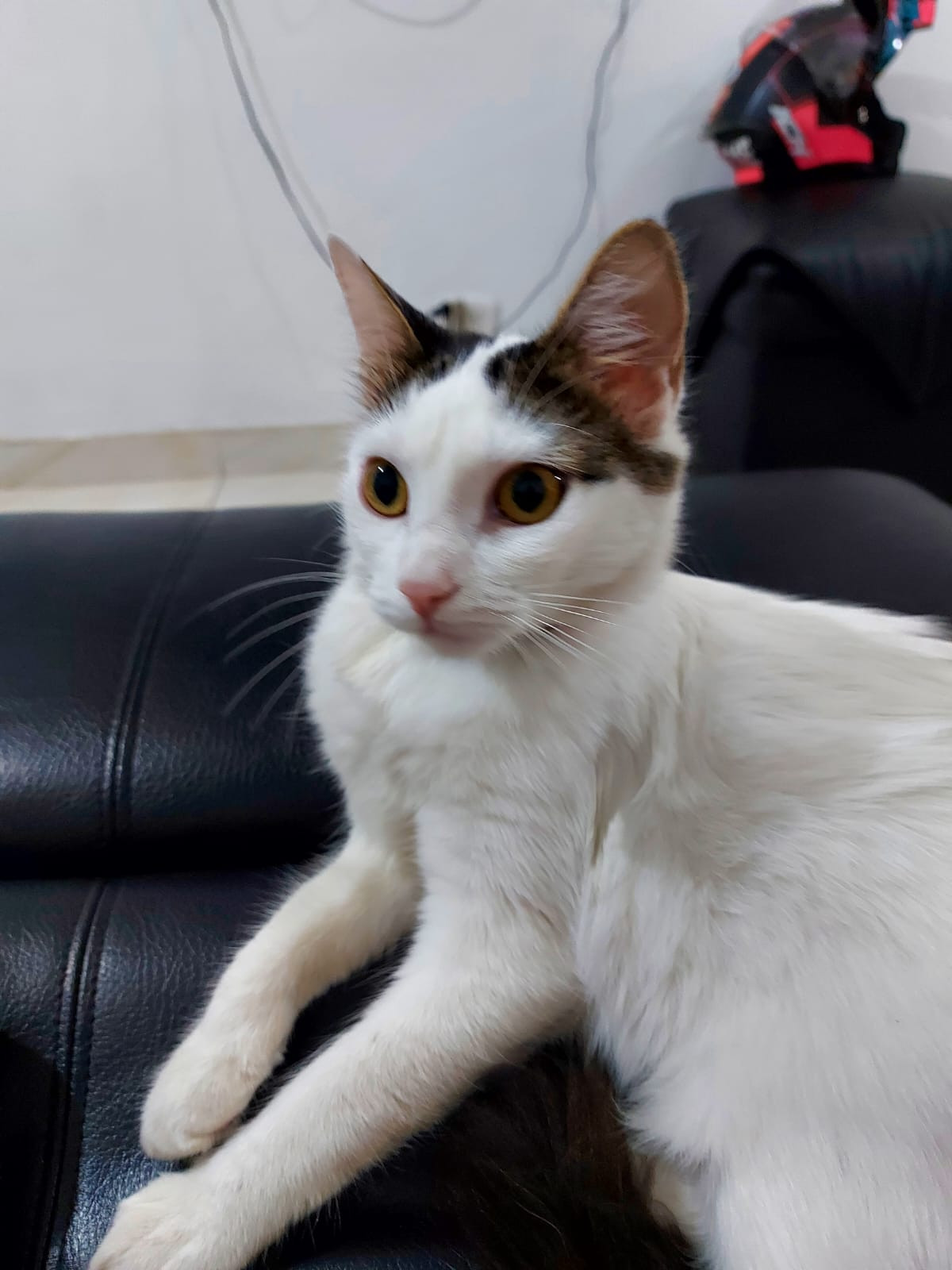 ✅ Es una gata blanca con manchas negras en las orejas, tiene pantaloncitos como atigrados grises y negros. Tiene sus ojos amarillos, nariz rosa.