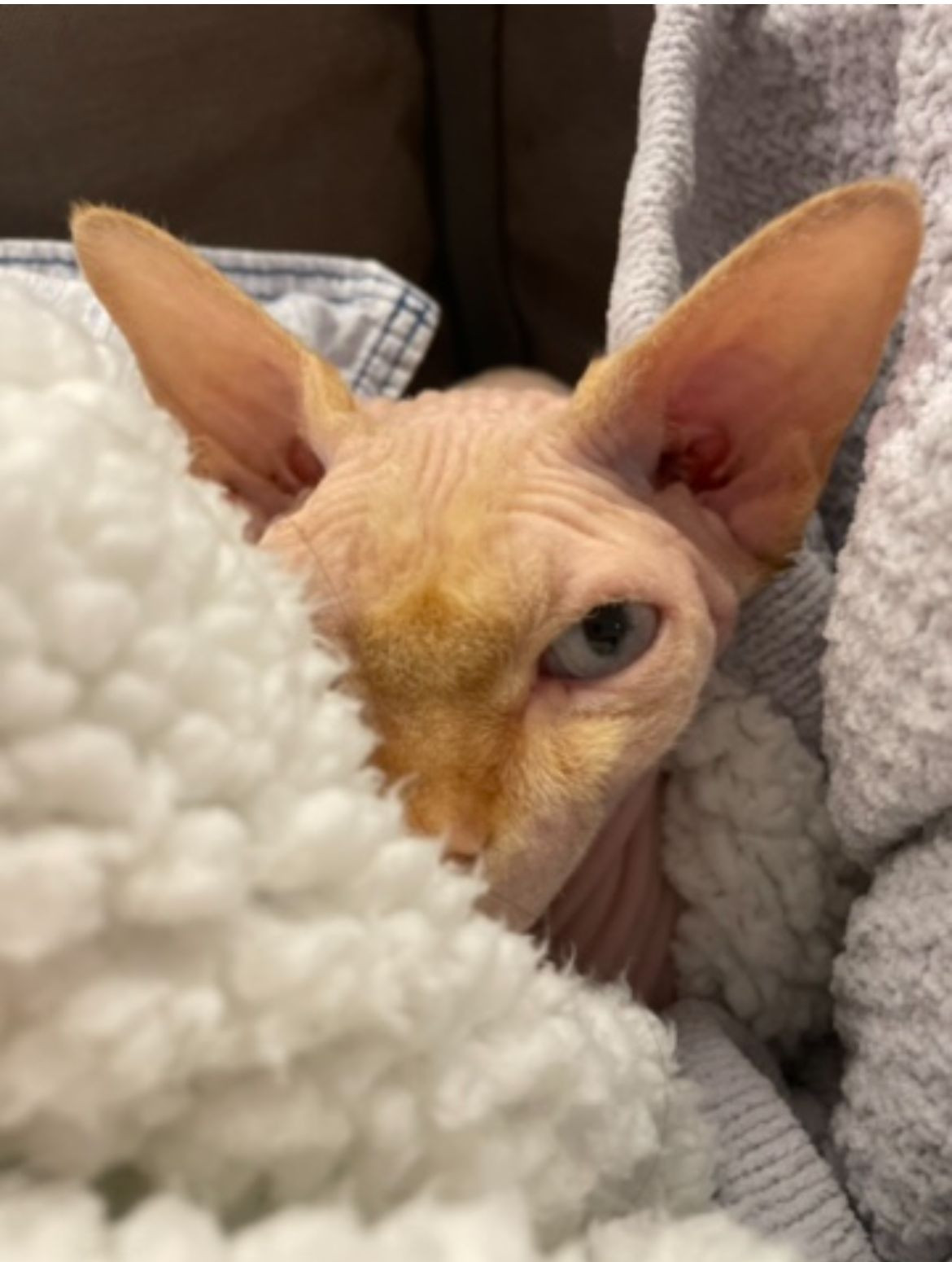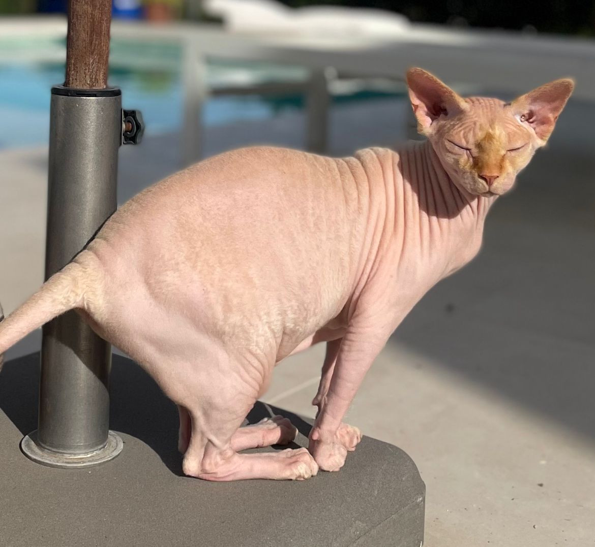 ✅ Es una gata rosada clara, sin pelo, ojos claros.