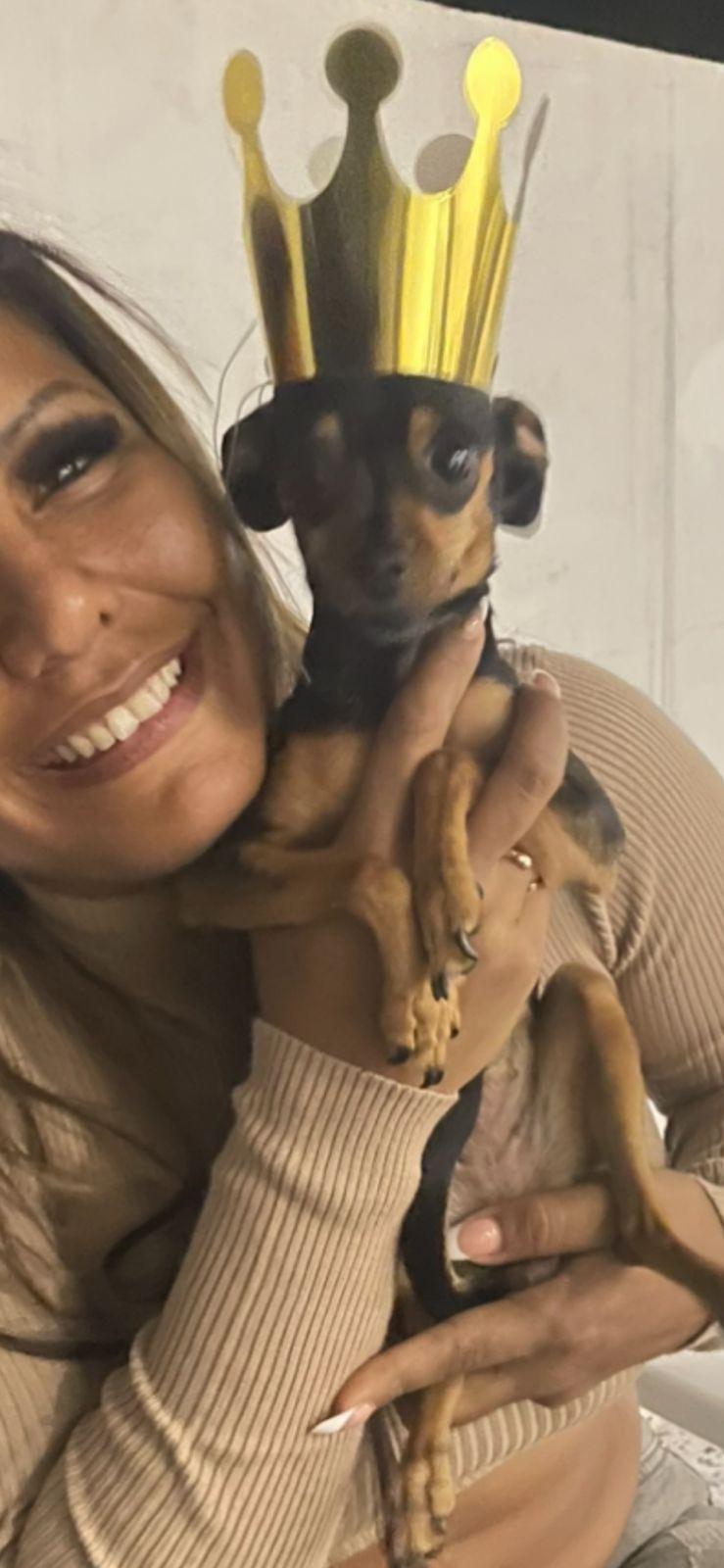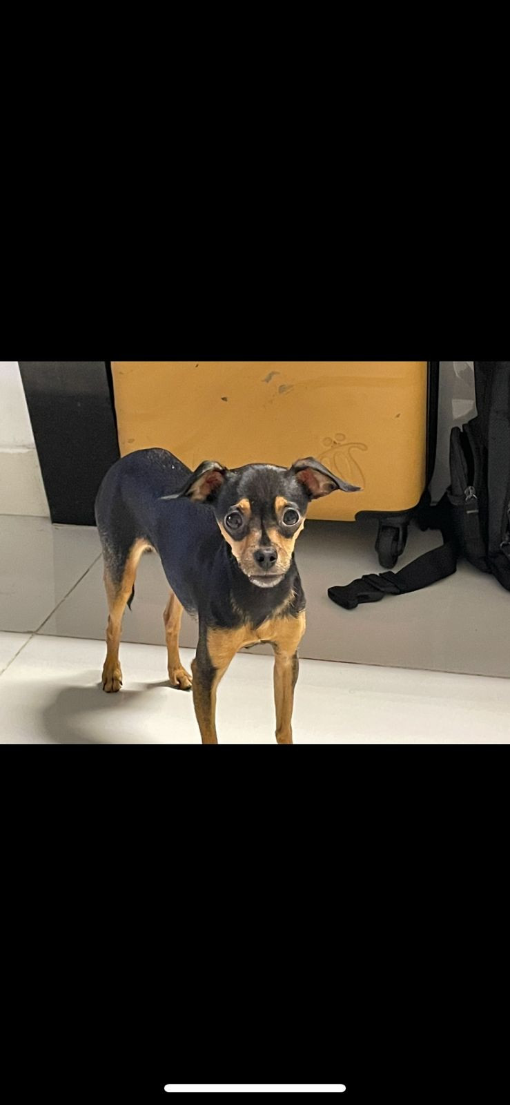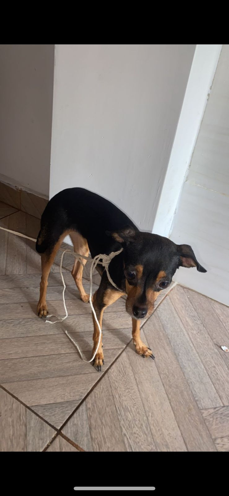 ✅ Es una perrita pinscher, sus patitas son largas, es negra con marrón, tiene orejitas caídas y es flaquita y tiene un colmillo del lado derecho.