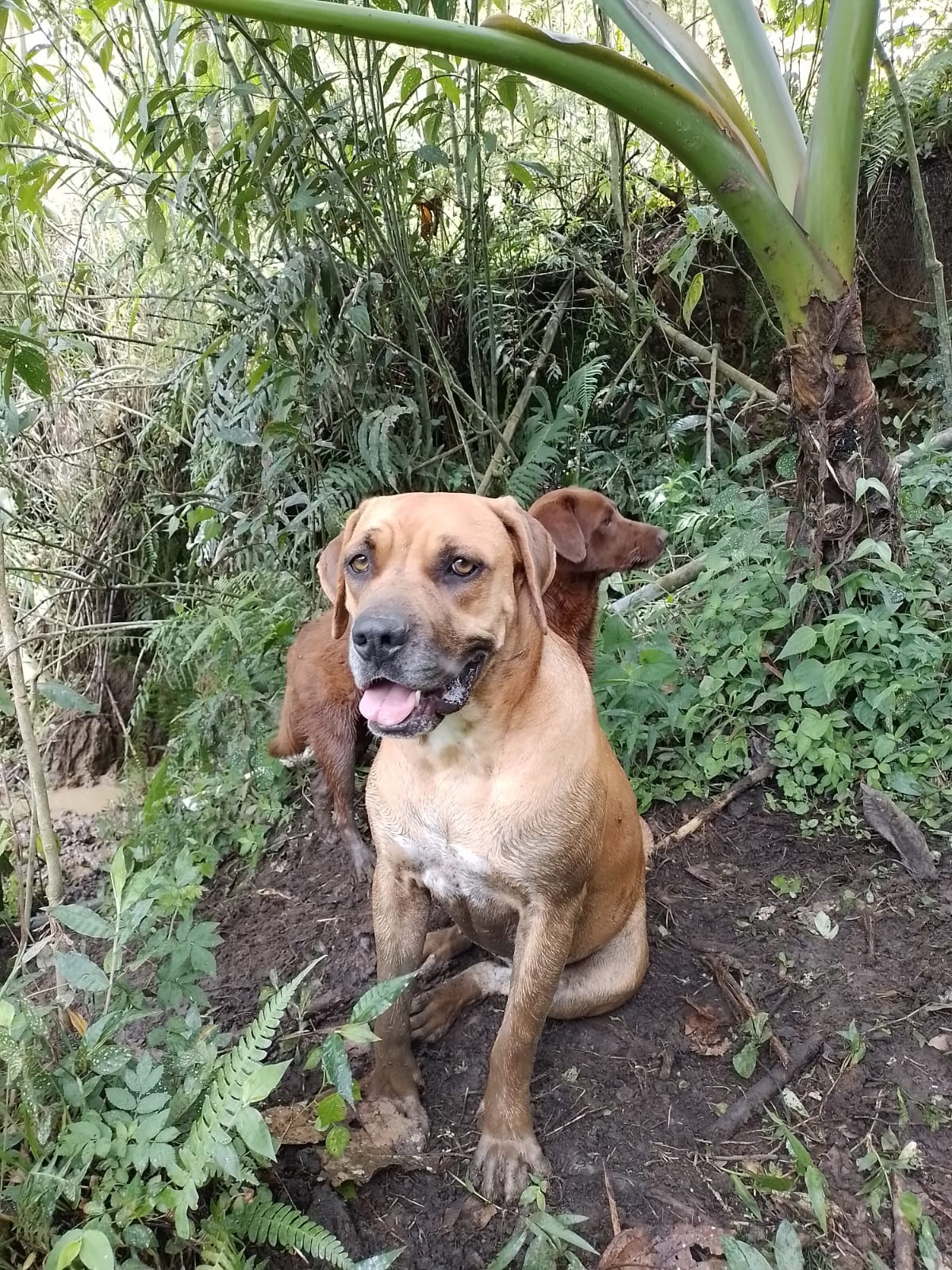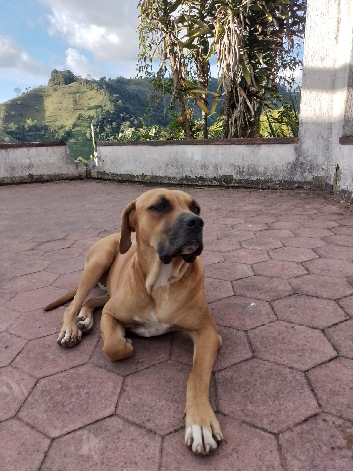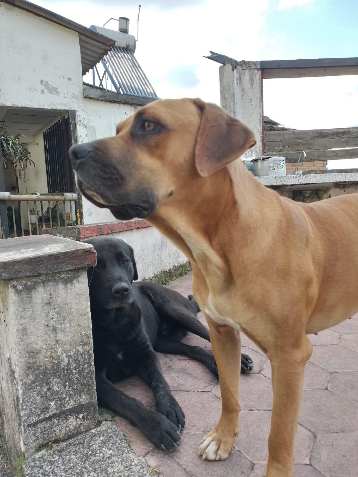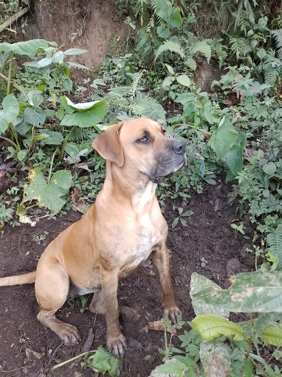 ✅ Es una perrita grande, fornida, trompi negra, es de color mostaza.