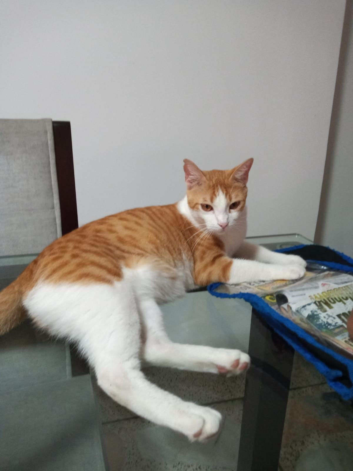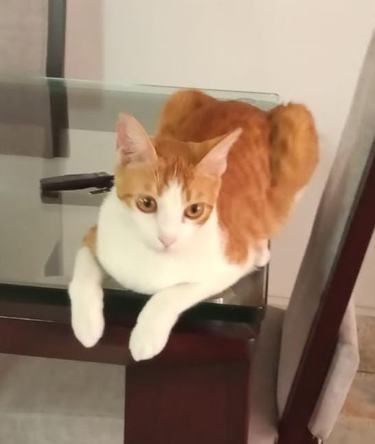 ✅ Es un gato blanco con amarillo atigrado, ojos amarillos, y tiene una marca de esterilización en su oreja derecha. Es un gato muy tranquilo, tímido, sus vacunas están al día.