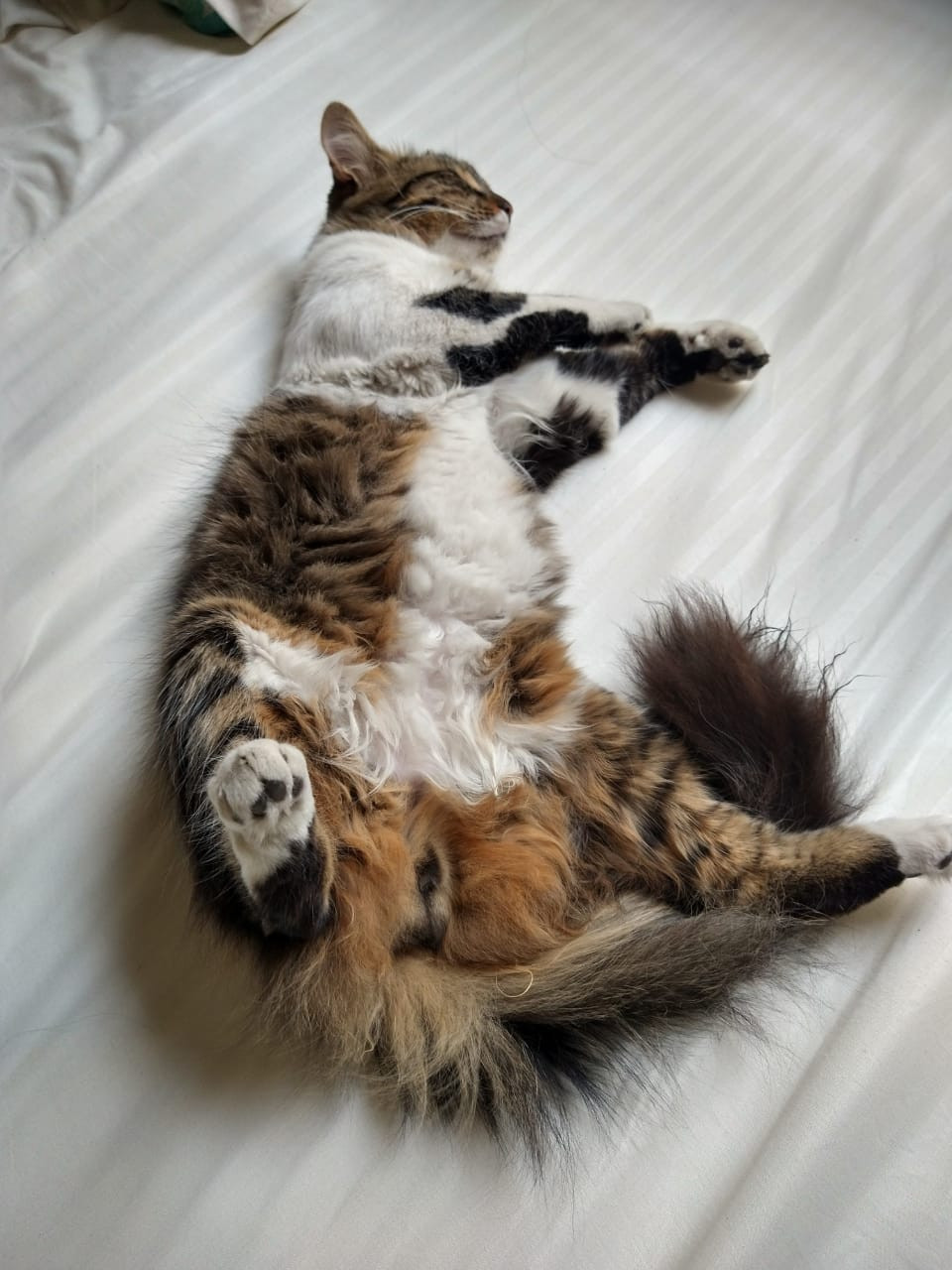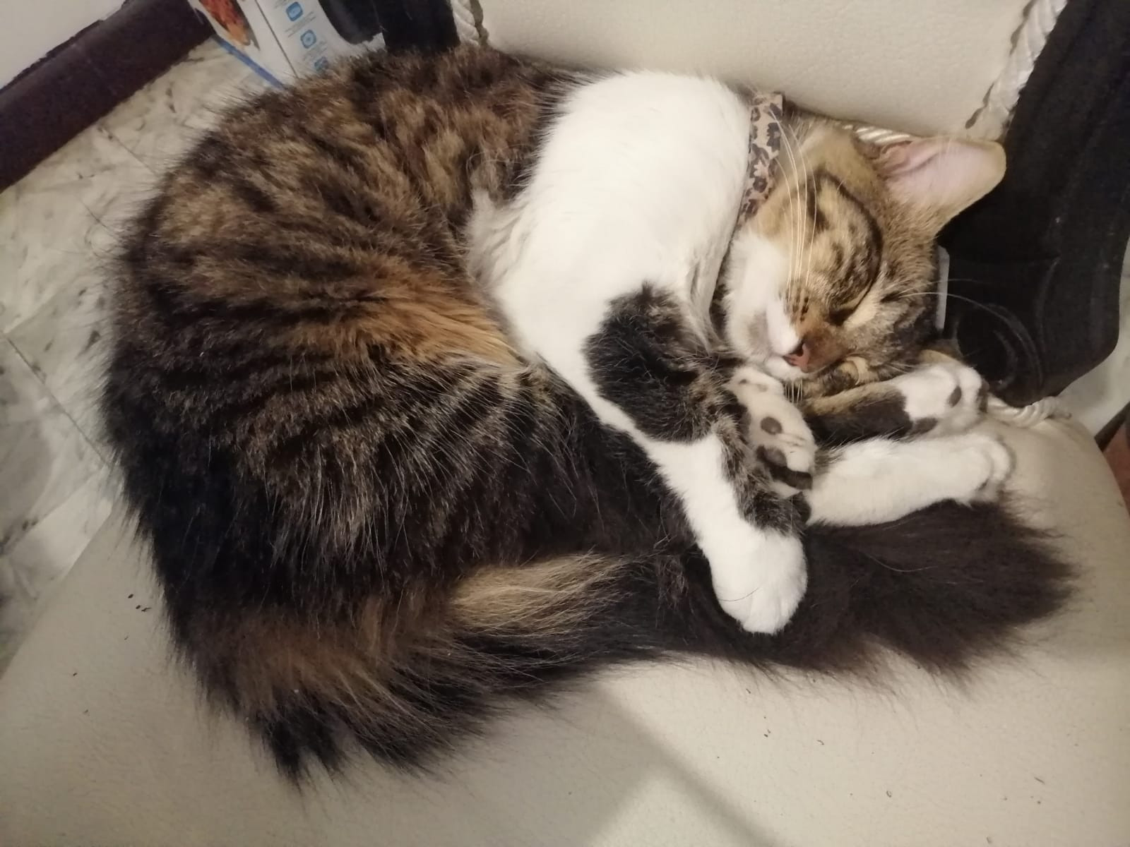 ✅ Es un gatito tricolor, su carita es combinada entre blanco, negro y café. En su lomo predomina el color negro y café, su pancita es blanca y las patas son blancas con negro, la cola es negra y peluda.