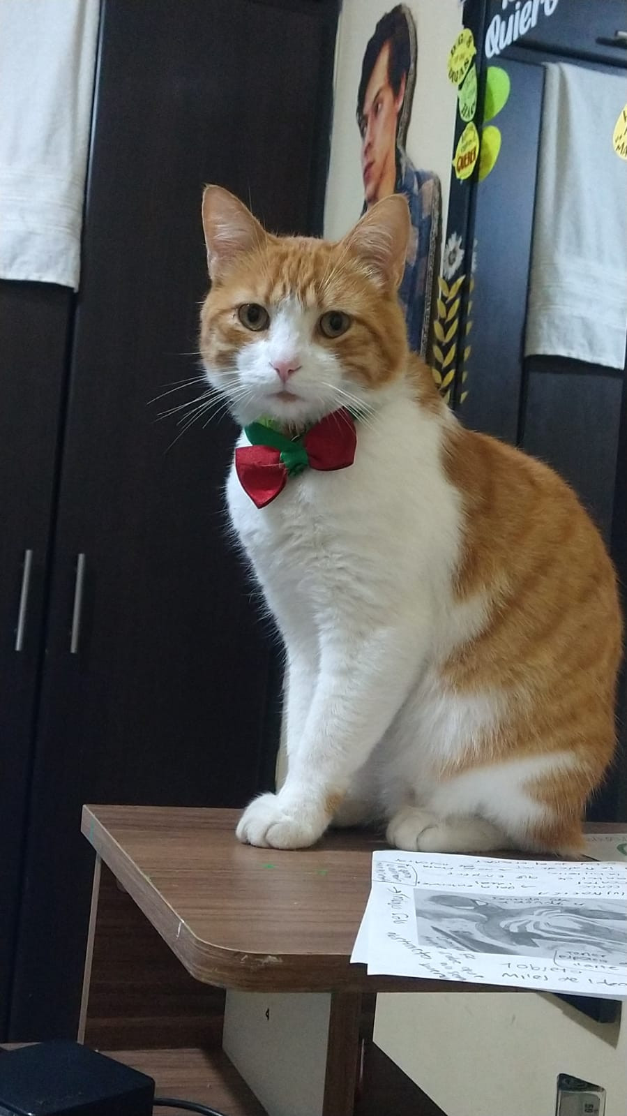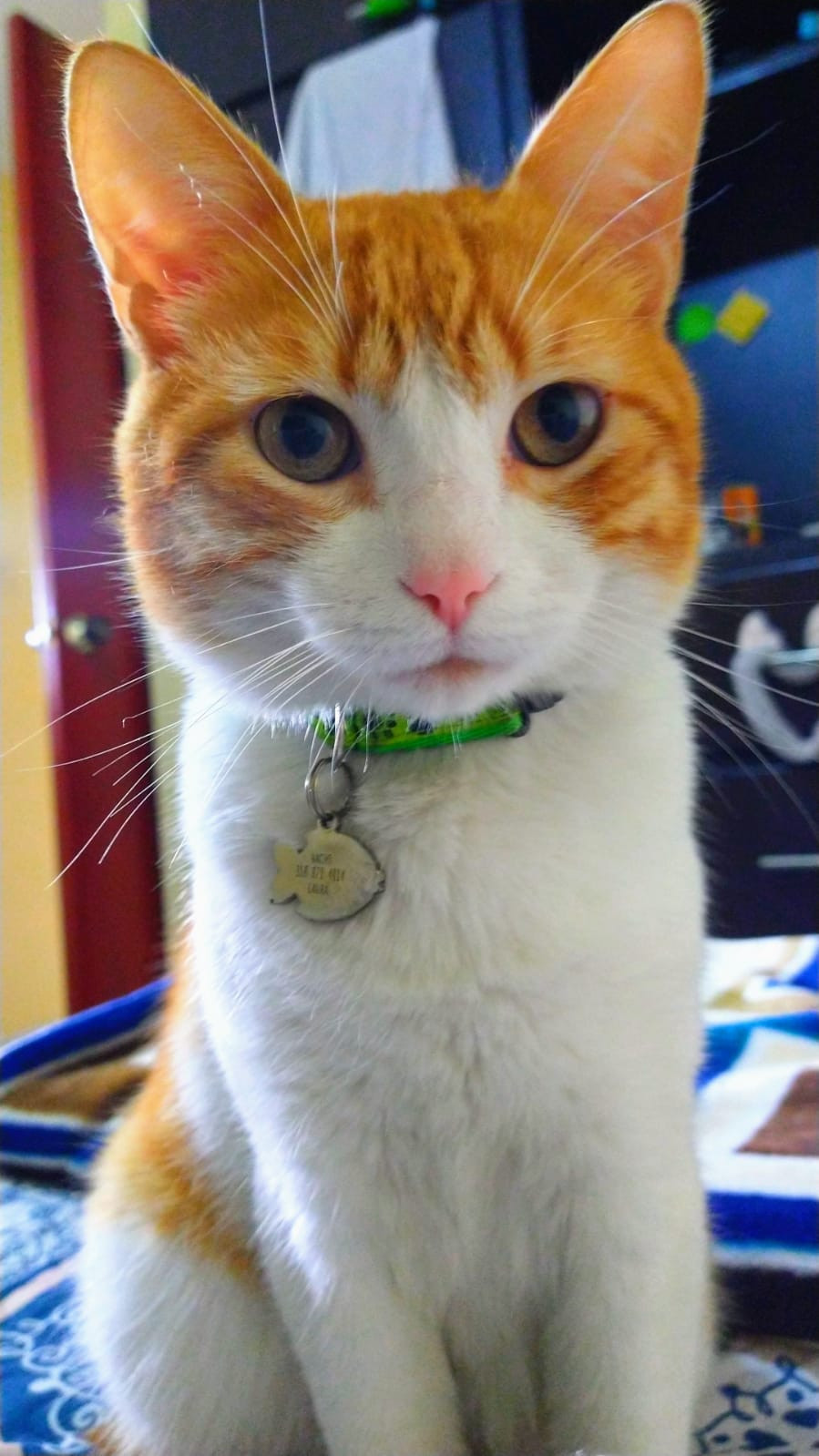 ✅ Es un gato macho naranja (en la parte de arriba) con blanco (en la parte de abajo), ojos miel verdosos, gordito, tiene pequeñas manchas cafés en el hocico, nariz rosadita.