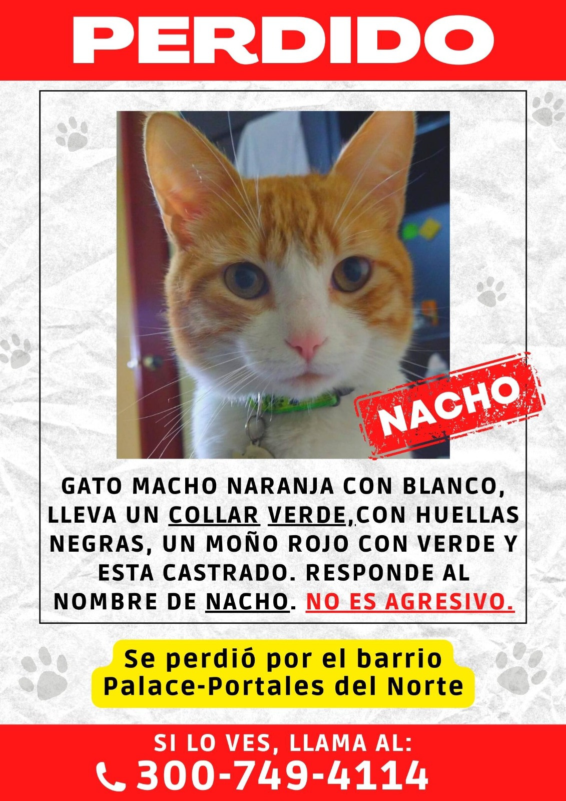 ✅ El día que se perdió llevaba un collar verde con figuritas de huellitas y moño rojo.