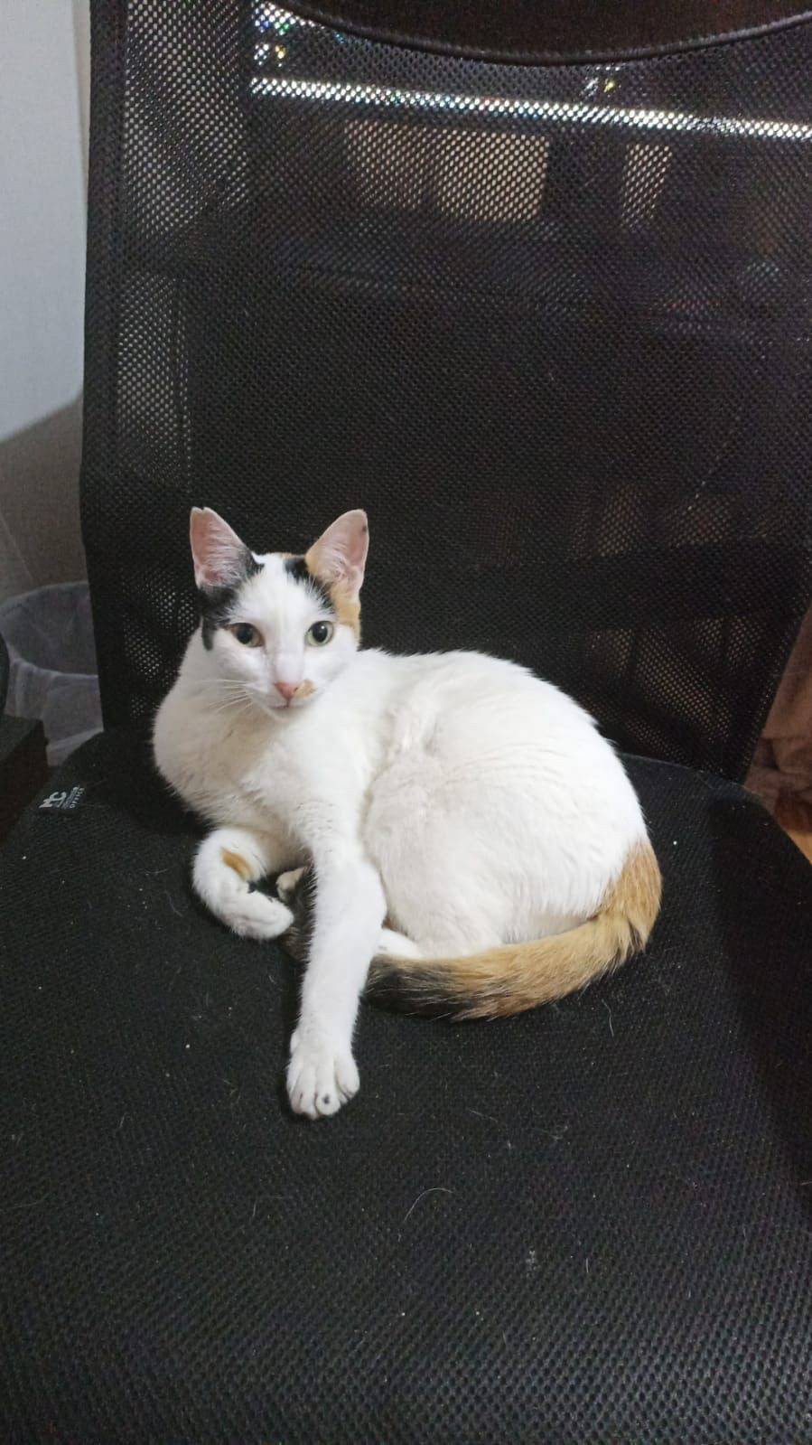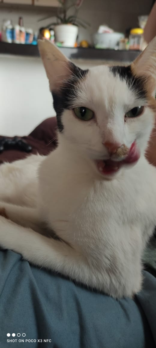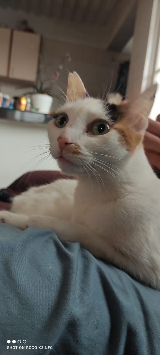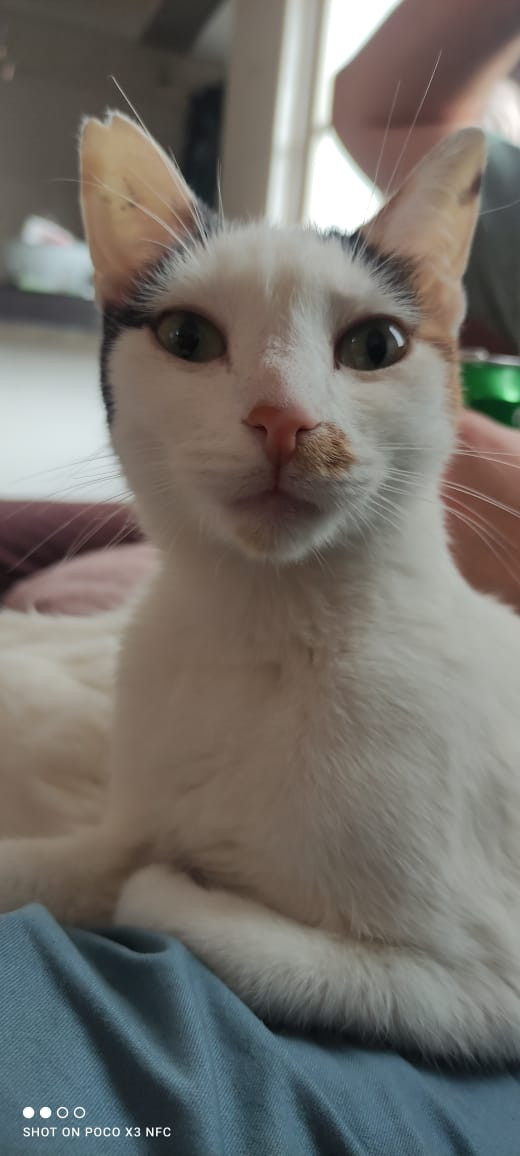 ✅ Es una gatita blanca, tiene en cada orejita una manchita negra y en una tiene negra y café, tiene una mancha café en su naricita, y la cola es toda café con negro, tiene un tatuaje y una muesquita en su oreja como señal de su esterilización.