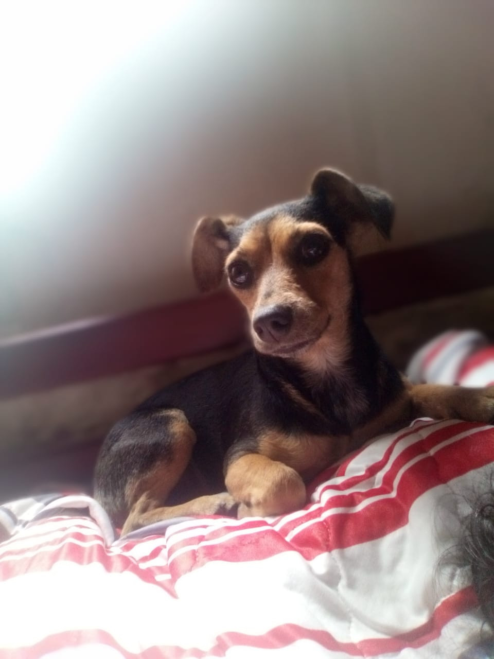✅ Es una perrita cruce de Pincher y criollo, es bien pequeña, no tiene colita, es negra encima y las patas amarillo claro, en el pecho tiene pelos blancos, las orejas son grandes.