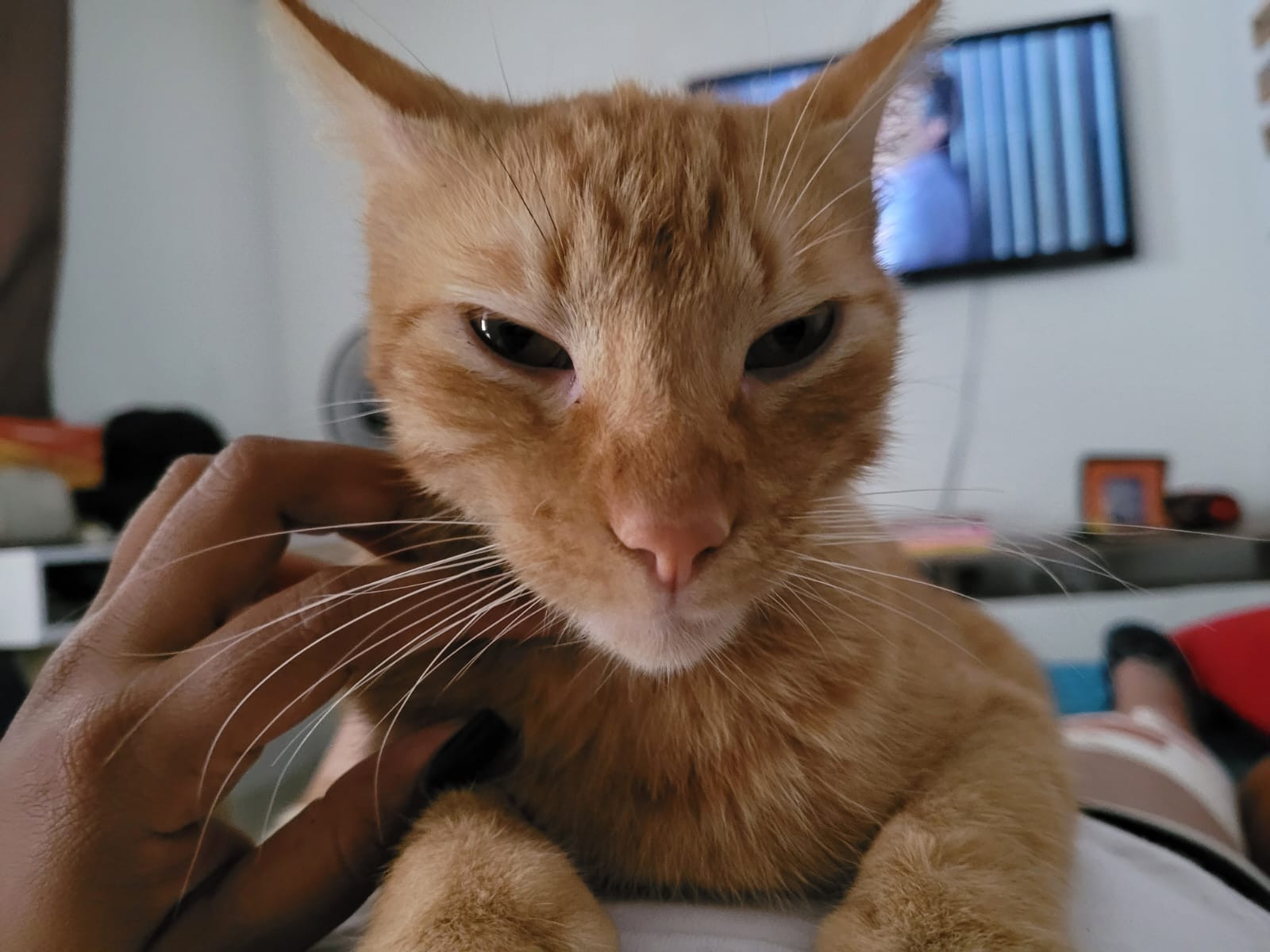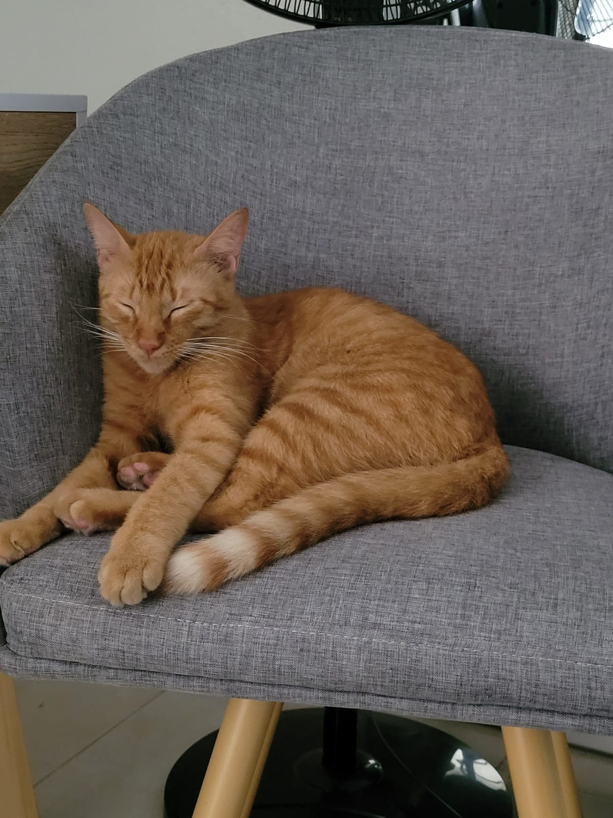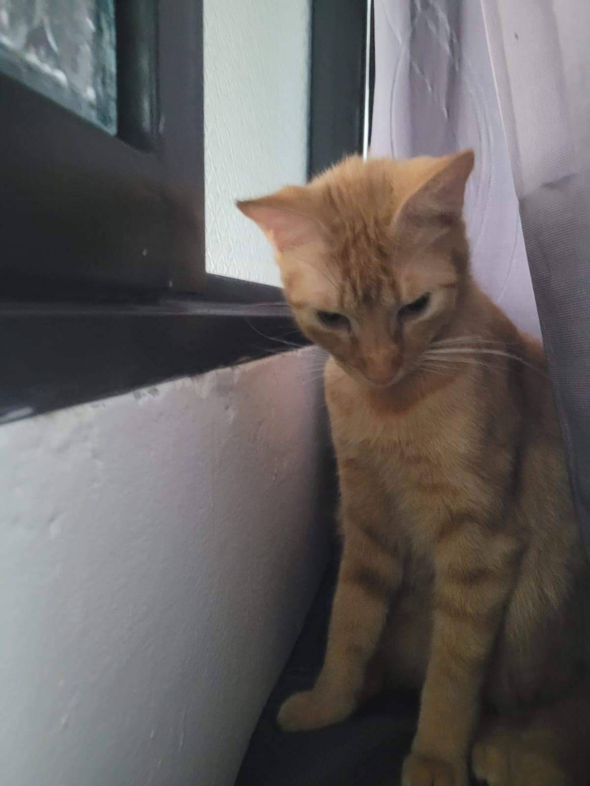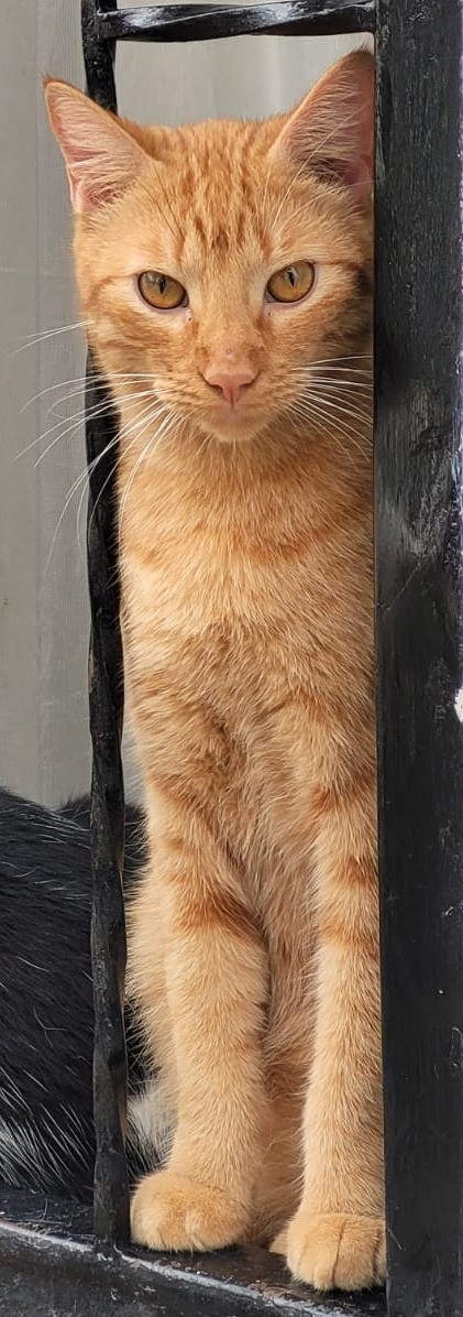✅ Es un gatito amarillo, tiene cinco franjas mas oscuritas en la punta de la cola, tiene dos puntos de cicatriz en la pata derecha (lo mordió un perro), tiene uno de su bigotes negro en el lado derecho, arriba de su ojo derecho dos de su bigotes o pelos largos negros también, no le gusta que lo carguen o agarren, pero si que lo acaricien.