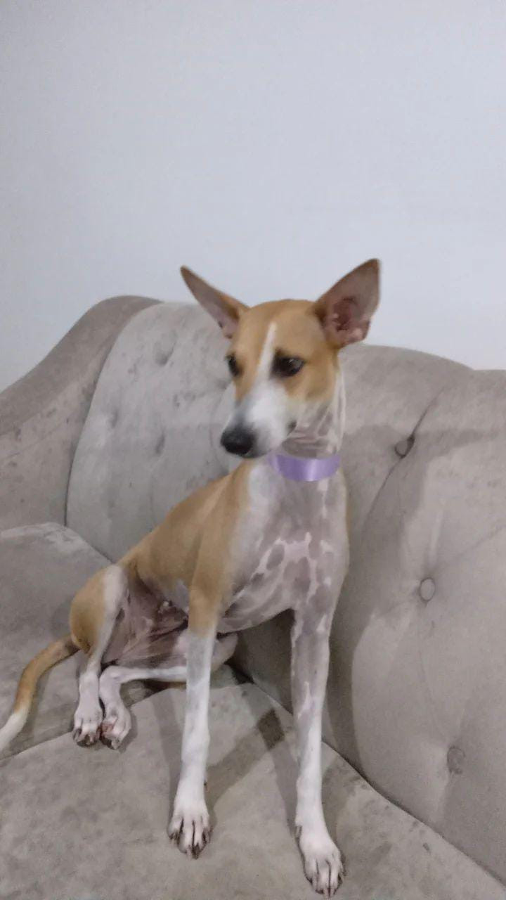 ✅ Es una perrita delgada color café, con machas café claro en el cuerpo estómago y extremidades, pelo blanco en el cuello, trompa alargada, cola larga.