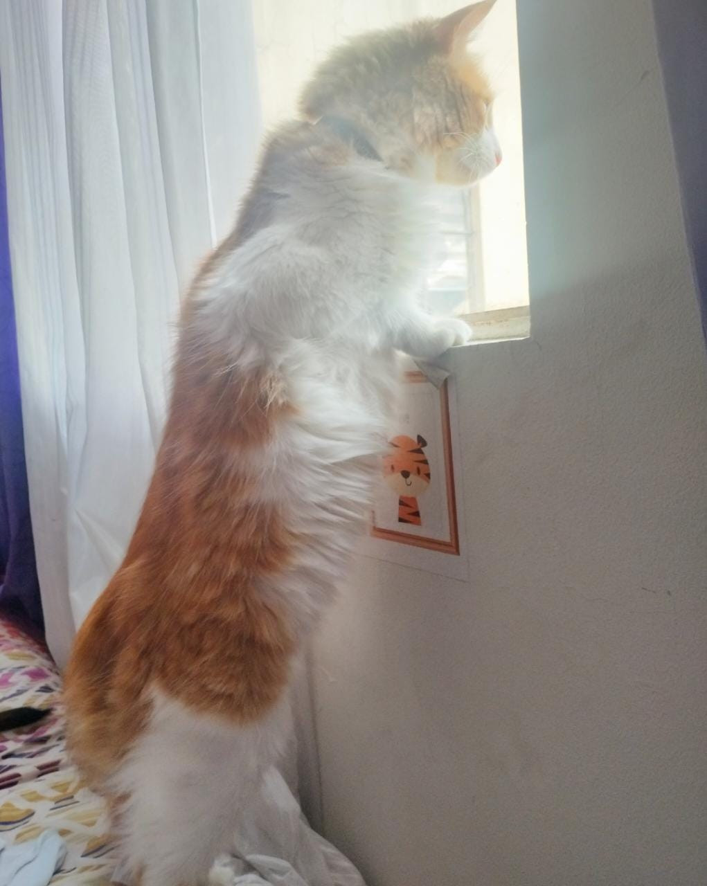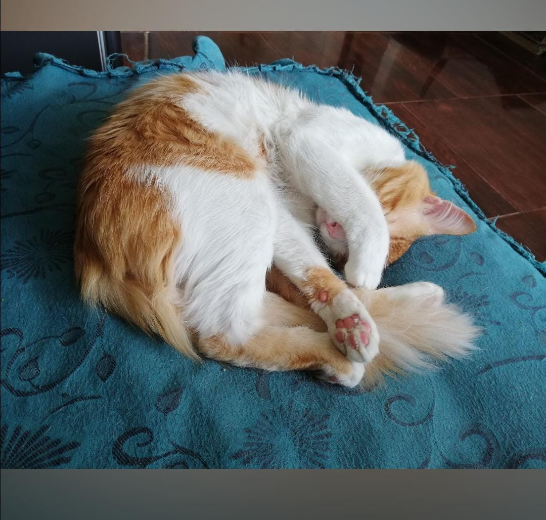 ✅ Gato amarillo en lomo, cola y parte de la cara y con blanco en parte de la cara y pecho, el pelaje es más largo que corto, y la cola es peluda y larga y mona.