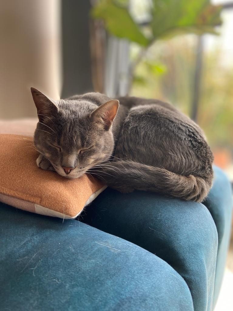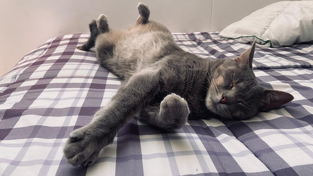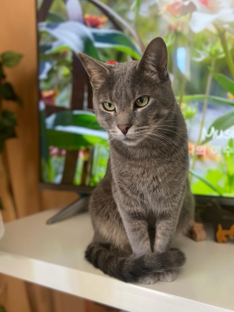 ✅ Es un gatico mediano, de patas cortas, pelaje suave gris, tiene un tatuaje en la oreja.